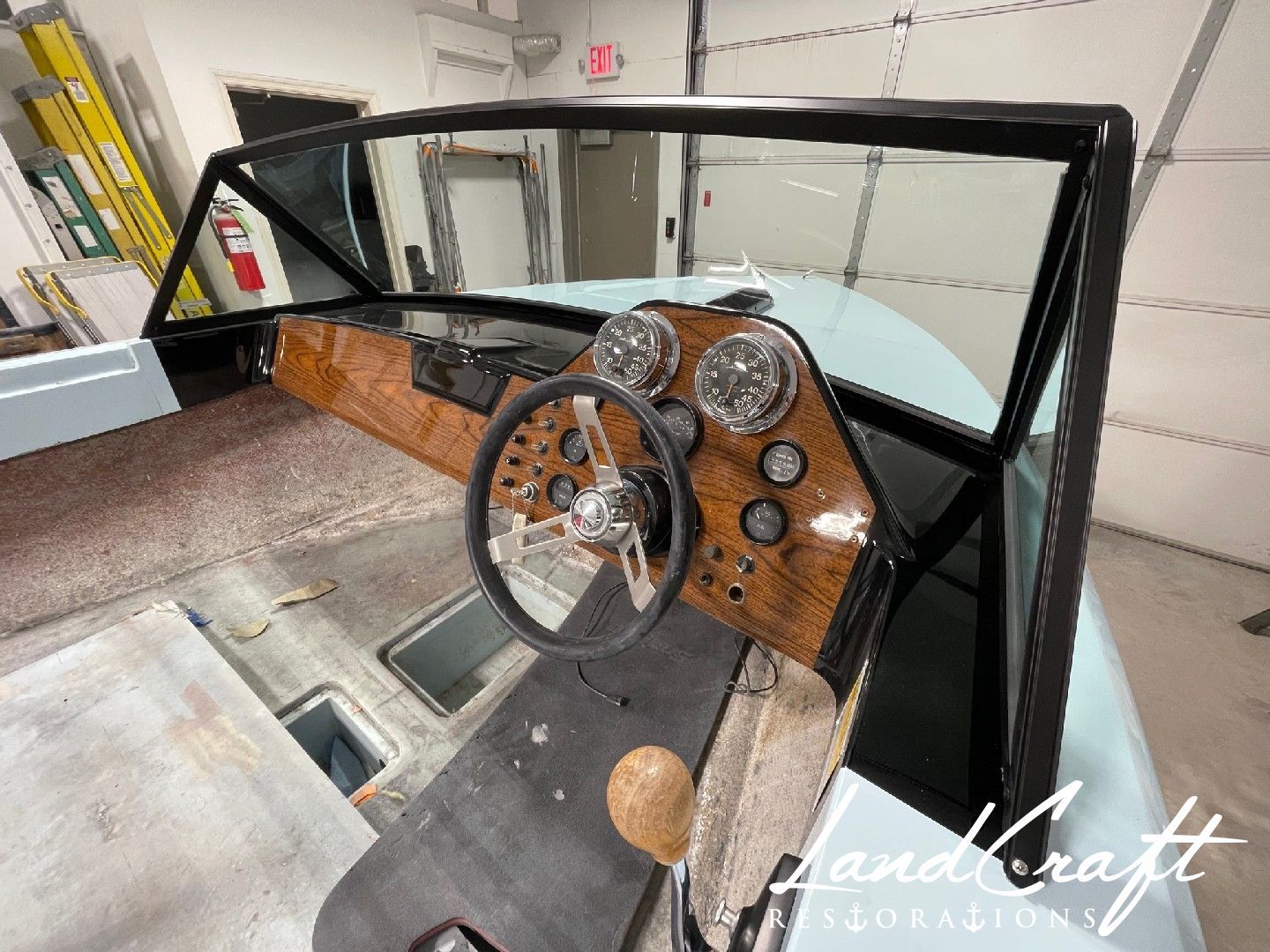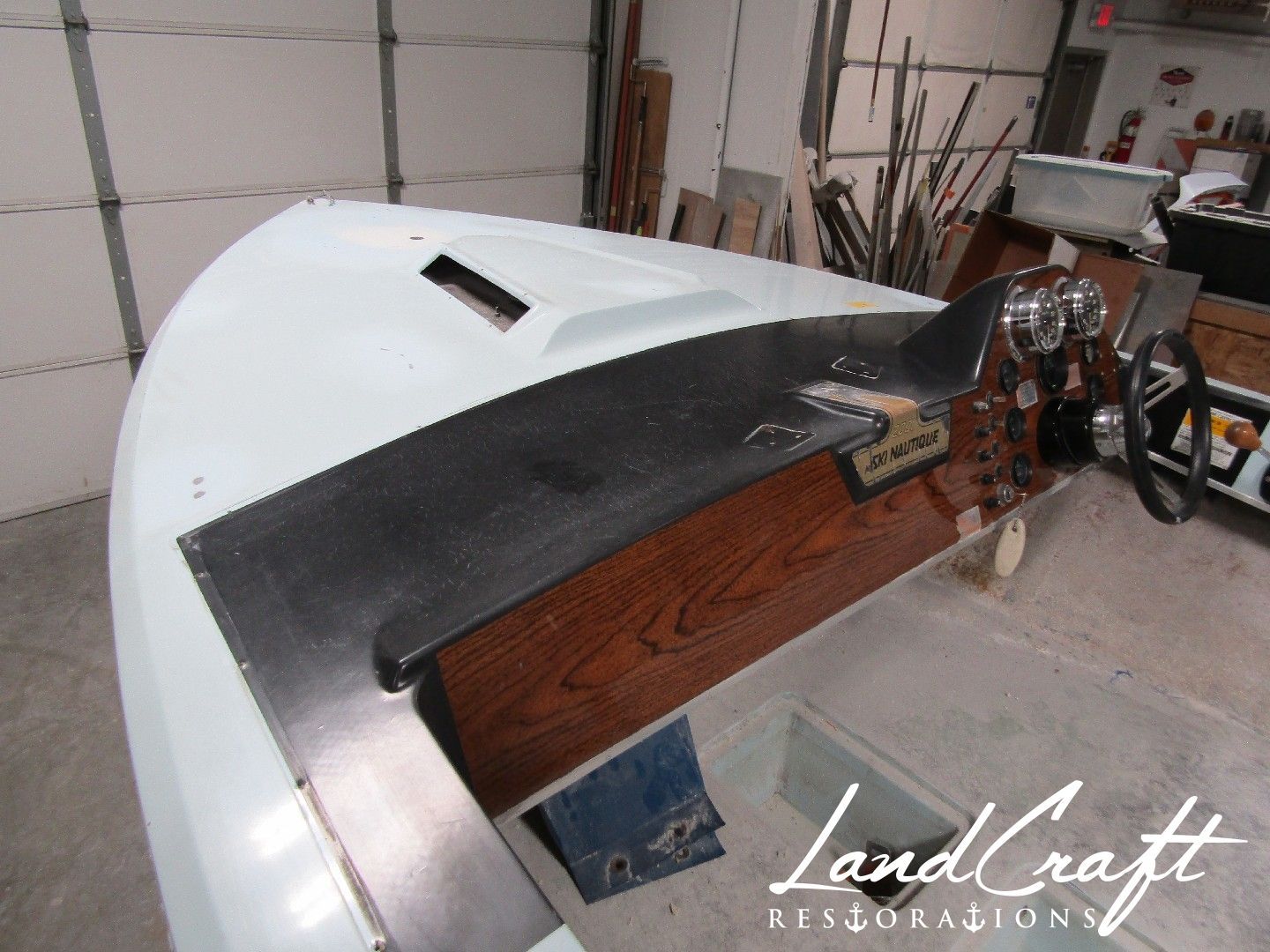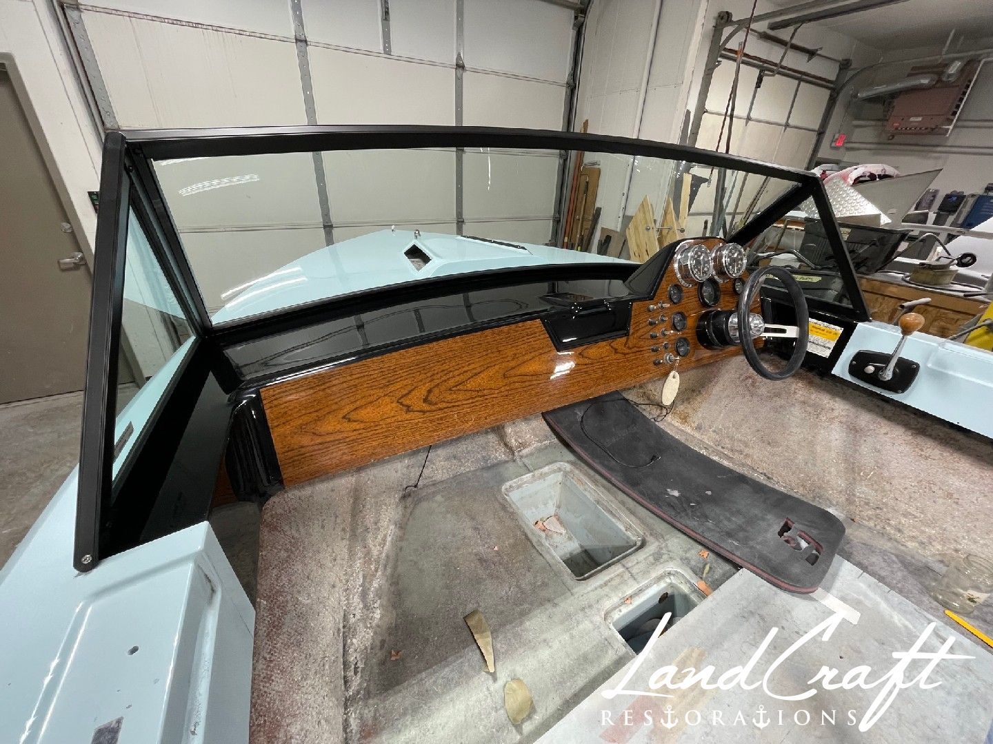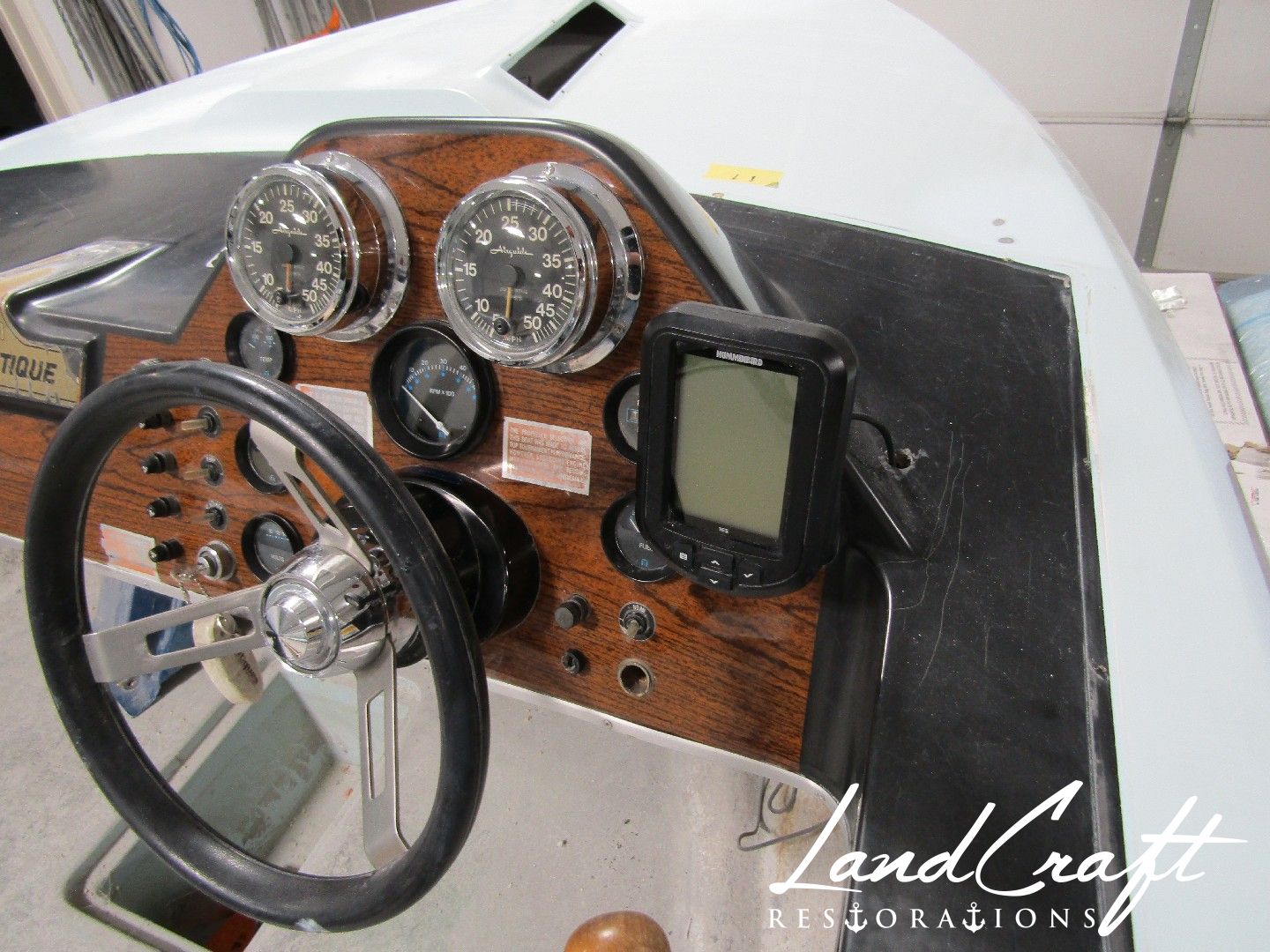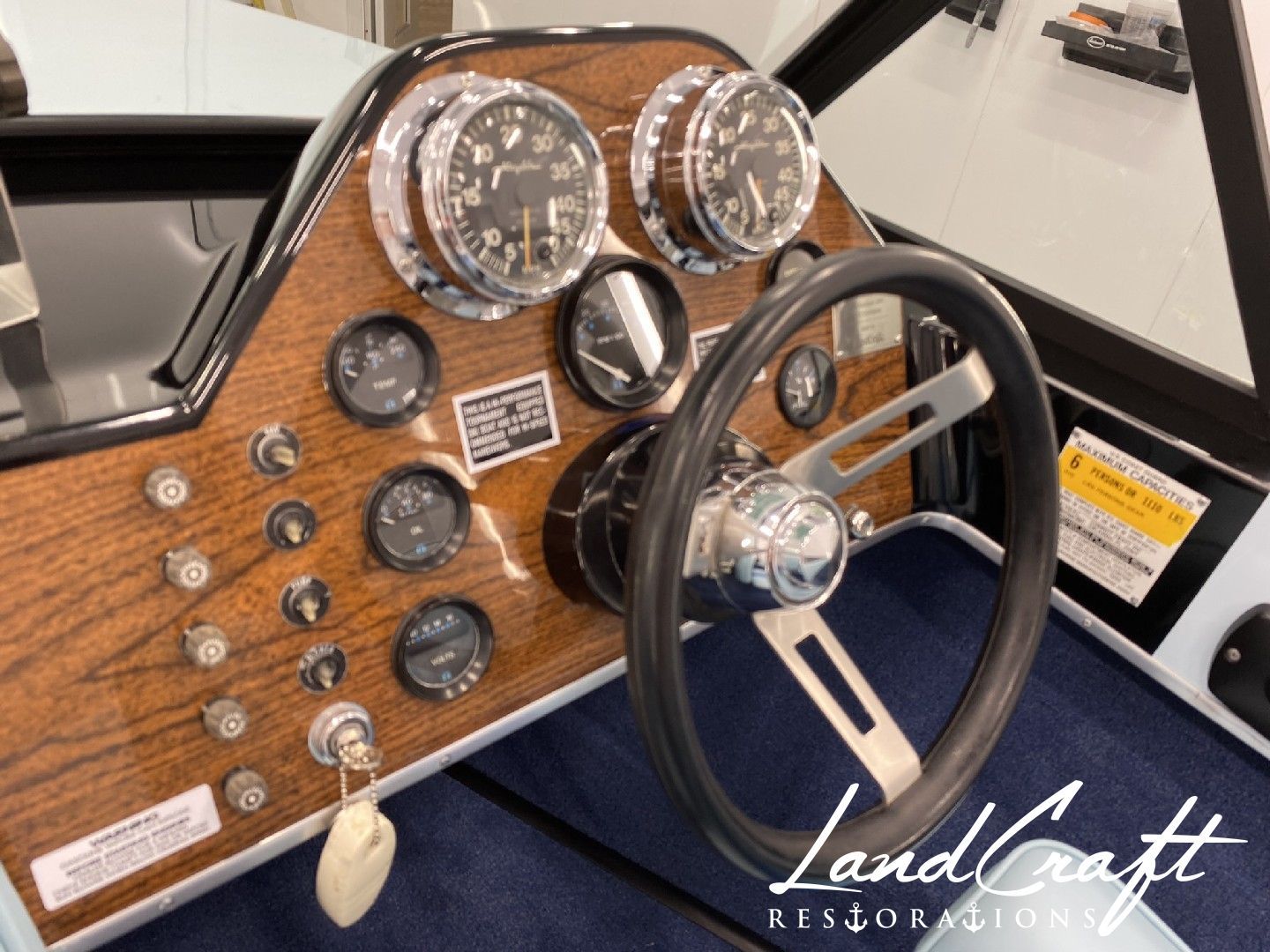 The photos start with the careful removal of the original ornamentation and show upper hull refinishing work before the top cap was lifted to remove the entire rotted wood floor. The Rally was sandwich core balsa constructed which required that sections of the damaged core be replaced as needed to restore a proper hull core. From there, bulkheads were replaced, a new gas tank installed, the transom was re-cored, flotation foam and a new floor also installed. The boat originally had dark blue berber carpeting which we replaced with an upgraded and more durable marine carpeting. The outer hull bottom required fiberglass and gelcoat repair, the original snaps for canvas were removed and holes patched, then we refurbished the original gelcoat and spot-repaired where needed. The windshield was refinished in the original brown color and the instrument panel was updated, refurbished and upgraded. The original steering wheel, hand rails, compass binnacle cover, horn, and cleats were all restored to original condition. The original combo bow light came in with melted plastic lenses and missing hardware—LandCraft® custom fabricated new lenses and retrofitted a new base to the original housing. New teak hatches were custom built for the rear storage compartments, giving the boat even more vintage appeal. New teak trim was custom fitted and installed around the consoles, and brightwork done to any remnants of original teak. Numerous original upholstery pieces were rotted, so the framing was rebuilt and wrapped in marine vinyl that was custom dyed to match the original upholstery. The extra padding of panels required a lot of finesse in the installation process, and you can see much of the interior is upholstered in the custom dyed, imprinted, pleated and button-tucked marine vinyl. The boat has been completely re-wired and also has new rubrail, a new bilge pump, new outboard engine, and more storage space with a custom rear hatch installed over the bilge compartment. The original decals were custom designed and reproduced for this boat, striping re-done to factory specs, a new custom canvas mooring cover and bimini top installed, and a new trailer custom built and painted to match the original.