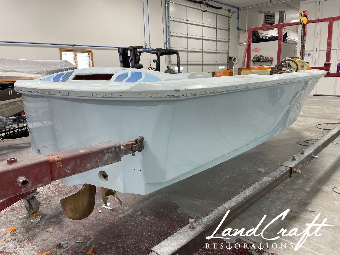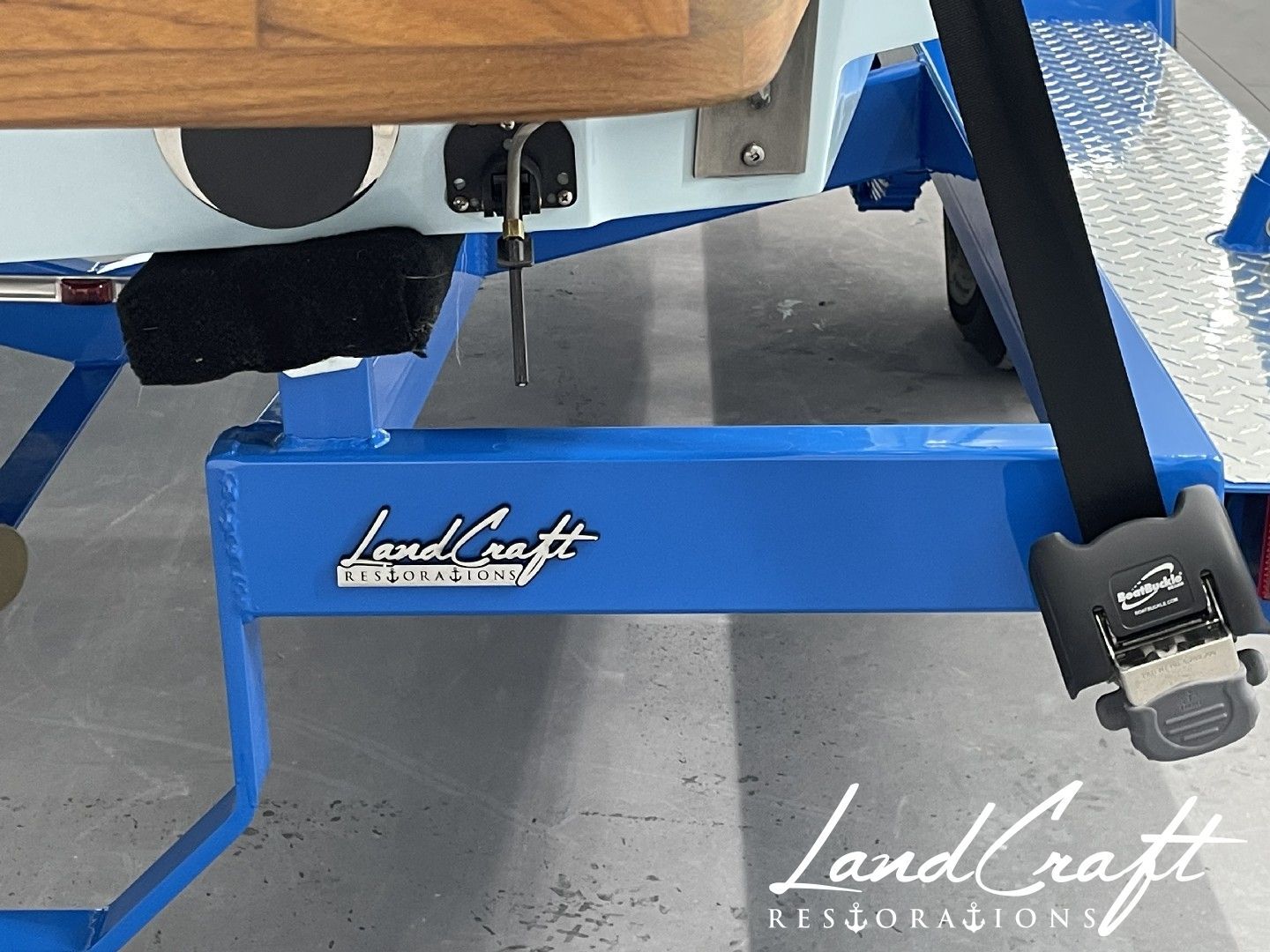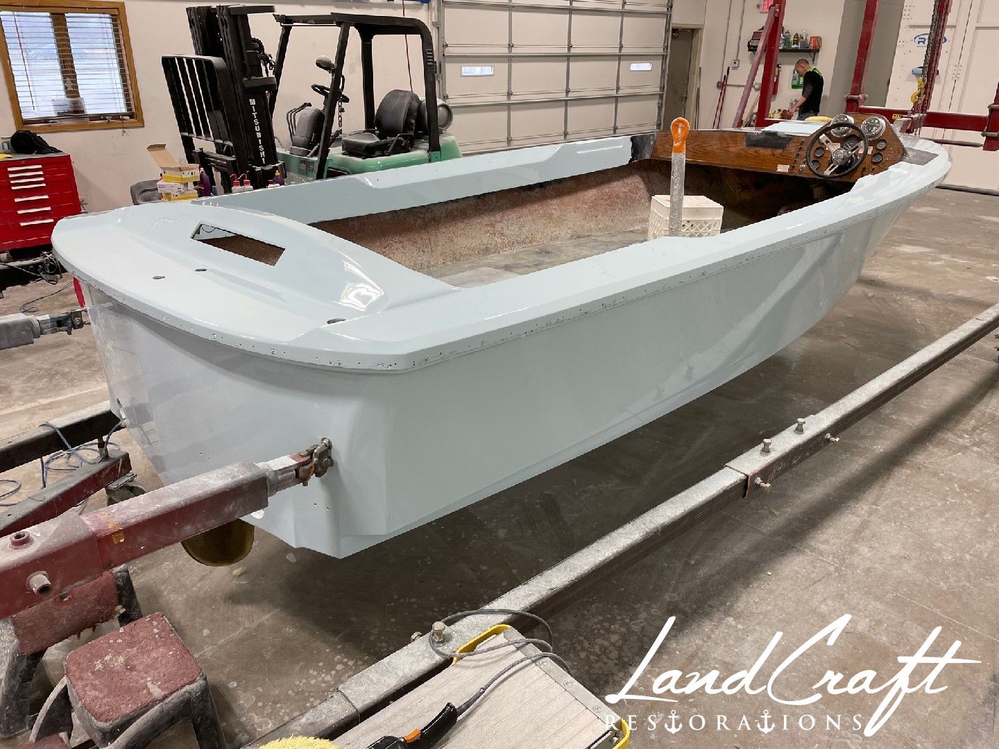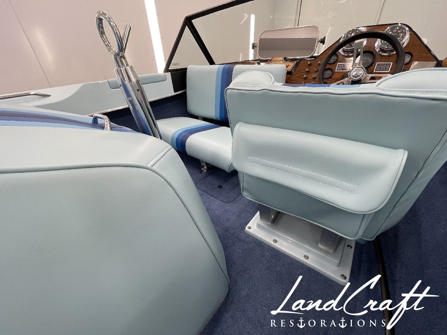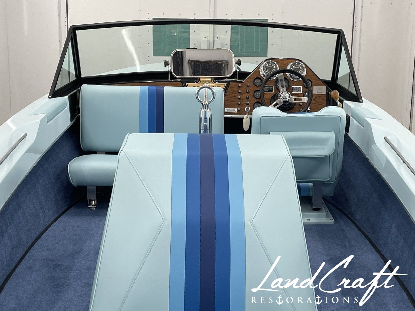 The photos start with the careful removal of the original ornamentation and show upper hull refinishing work before the top cap was lifted to remove the entire rotted wood floor. The Rally was sandwich core balsa constructed which required that sections of the damaged core be replaced as needed to restore a proper hull core. From there, bulkheads were replaced, a new gas tank installed, the transom was re-cored, flotation foam and a new floor also installed. The boat originally had dark blue berber carpeting which we replaced with an upgraded and more durable marine carpeting. The outer hull bottom required fiberglass and gelcoat repair, the original snaps for canvas were removed and holes patched, then we refurbished the original gelcoat and spot-repaired where needed. The windshield was refinished in the original brown color and the instrument panel was updated, refurbished and upgraded. The original steering wheel, hand rails, compass binnacle cover, horn, and cleats were all restored to original condition. The original combo bow light came in with melted plastic lenses and missing hardware—LandCraft® custom fabricated new lenses and retrofitted a new base to the original housing. New teak hatches were custom built for the rear storage compartments, giving the boat even more vintage appeal. New teak trim was custom fitted and installed around the consoles, and brightwork done to any remnants of original teak. Numerous original upholstery pieces were rotted, so the framing was rebuilt and wrapped in marine vinyl that was custom dyed to match the original upholstery. The extra padding of panels required a lot of finesse in the installation process, and you can see much of the interior is upholstered in the custom dyed, imprinted, pleated and button-tucked marine vinyl. The boat has been completely re-wired and also has new rubrail, a new bilge pump, new outboard engine, and more storage space with a custom rear hatch installed over the bilge compartment. The original decals were custom designed and reproduced for this boat, striping re-done to factory specs, a new custom canvas mooring cover and bimini top installed, and a new trailer custom built and painted to match the original.