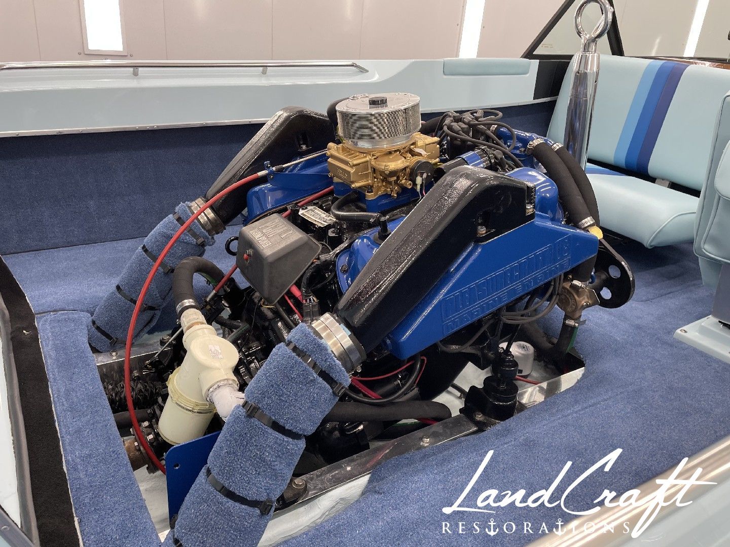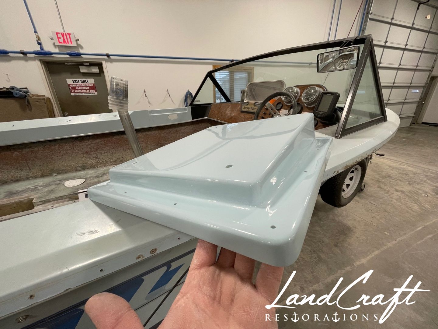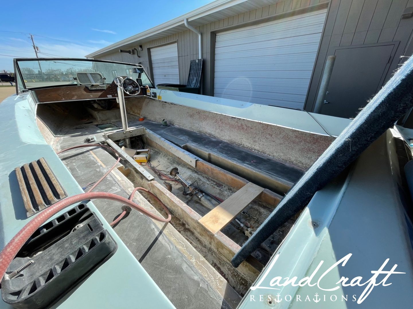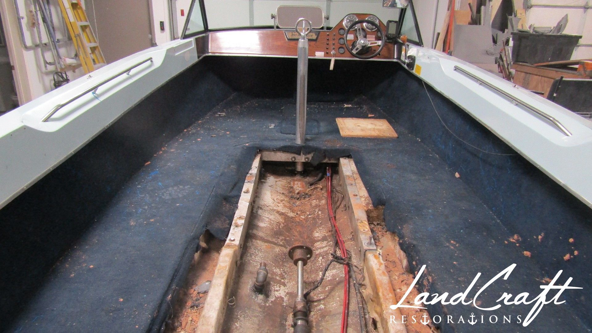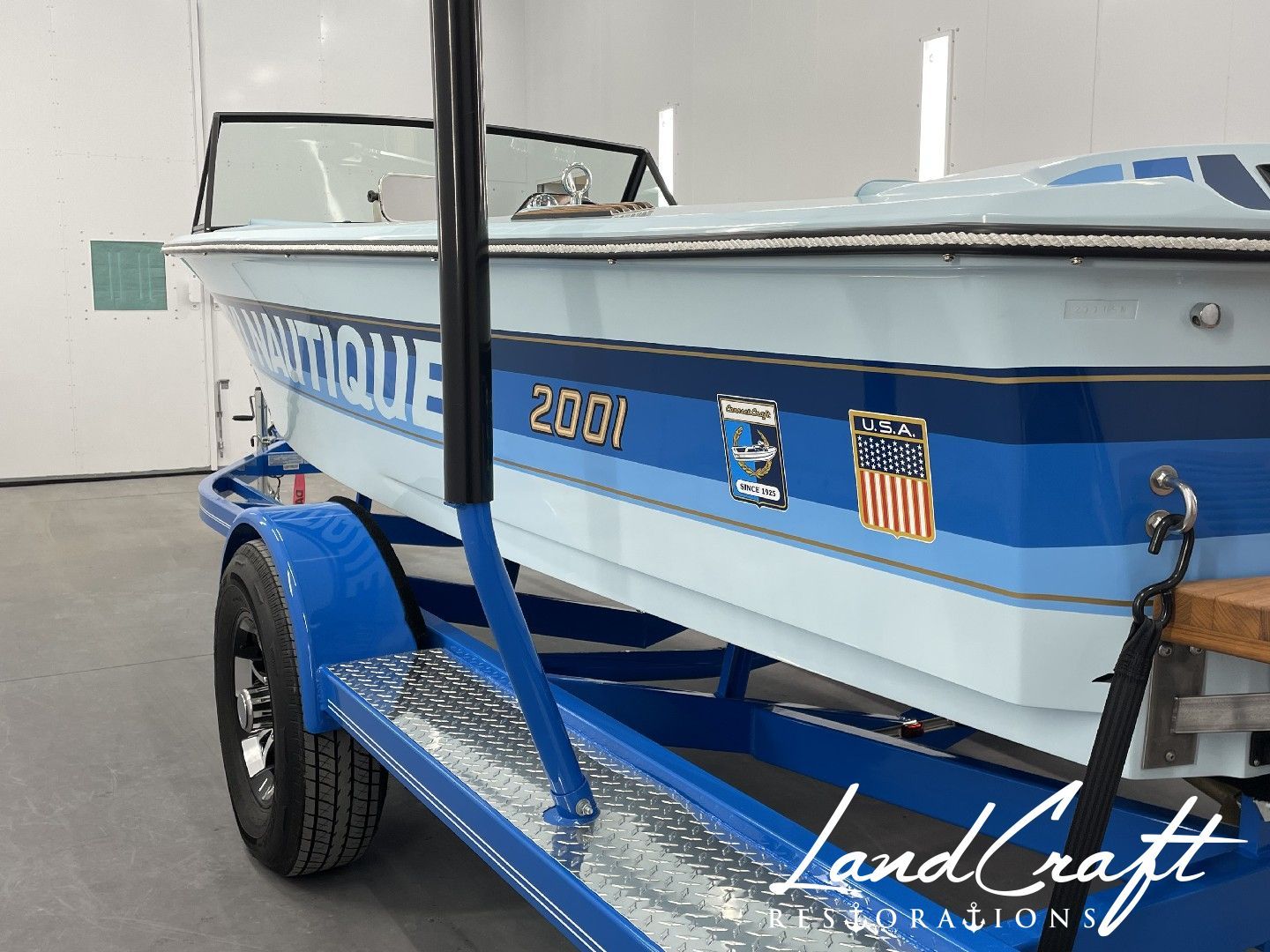 The photos start with the careful removal of the original ornamentation and show upper hull refinishing work before the top cap was lifted to remove the entire rotted wood floor. The Rally was sandwich core balsa constructed which required that sections of the damaged core be replaced as needed to restore a proper hull core. From there, bulkheads were replaced, a new gas tank installed, the transom was re-cored, flotation foam and a new floor also installed. The boat originally had dark blue berber carpeting which we replaced with an upgraded and more durable marine carpeting. The outer hull bottom required fiberglass and gelcoat repair, the original snaps for canvas were removed and holes patched, then we refurbished the original gelcoat and spot-repaired where needed. The windshield was refinished in the original brown color and the instrument panel was updated, refurbished and upgraded. The original steering wheel, hand rails, compass binnacle cover, horn, and cleats were all restored to original condition. The original combo bow light came in with melted plastic lenses and missing hardware—LandCraft® custom fabricated new lenses and retrofitted a new base to the original housing. New teak hatches were custom built for the rear storage compartments, giving the boat even more vintage appeal. New teak trim was custom fitted and installed around the consoles, and brightwork done to any remnants of original teak. Numerous original upholstery pieces were rotted, so the framing was rebuilt and wrapped in marine vinyl that was custom dyed to match the original upholstery. The extra padding of panels required a lot of finesse in the installation process, and you can see much of the interior is upholstered in the custom dyed, imprinted, pleated and button-tucked marine vinyl. The boat has been completely re-wired and also has new rubrail, a new bilge pump, new outboard engine, and more storage space with a custom rear hatch installed over the bilge compartment. The original decals were custom designed and reproduced for this boat, striping re-done to factory specs, a new custom canvas mooring cover and bimini top installed, and a new trailer custom built and painted to match the original.