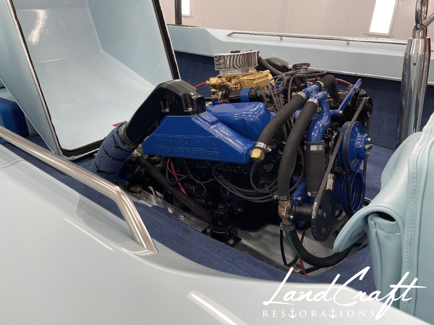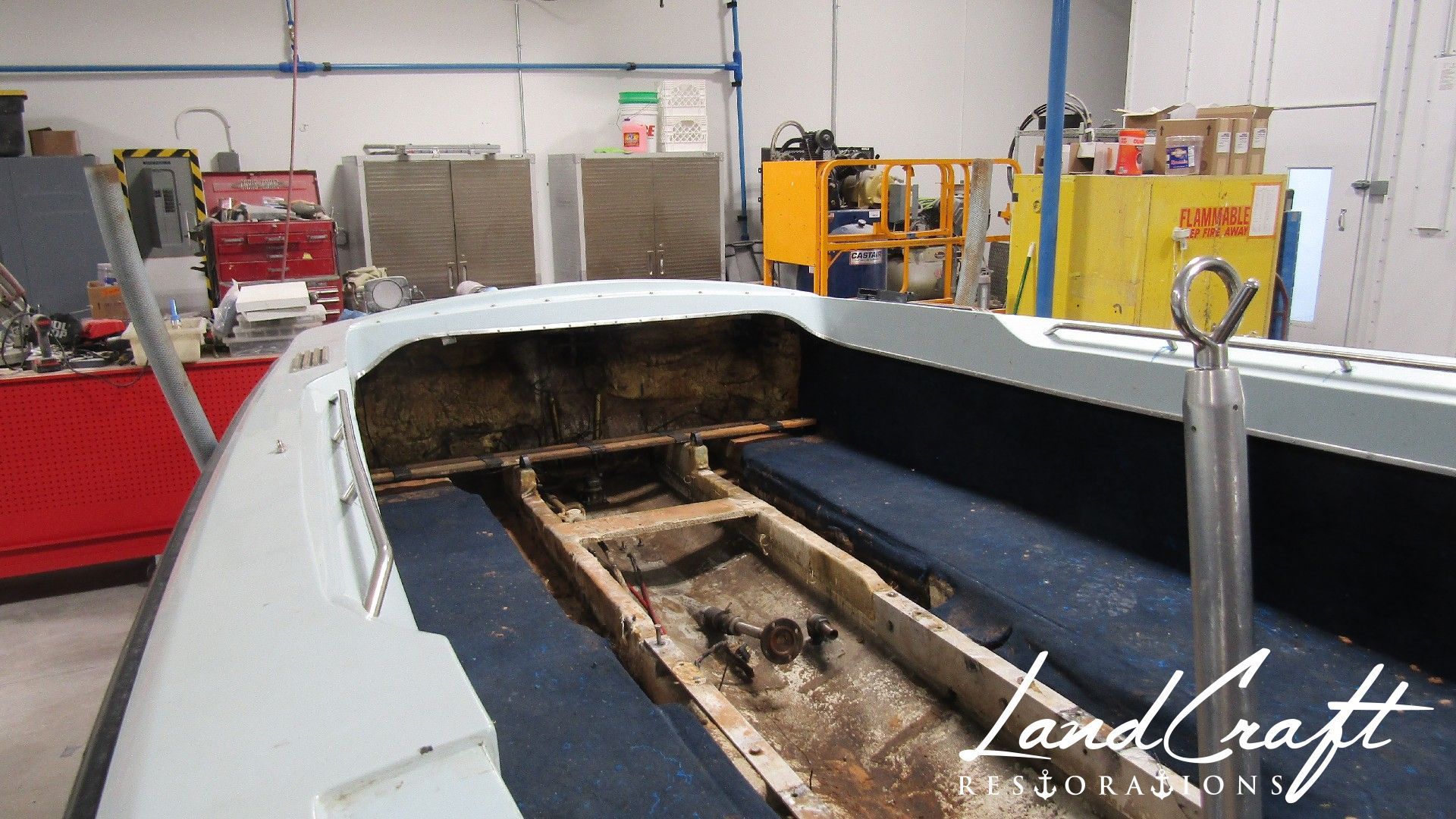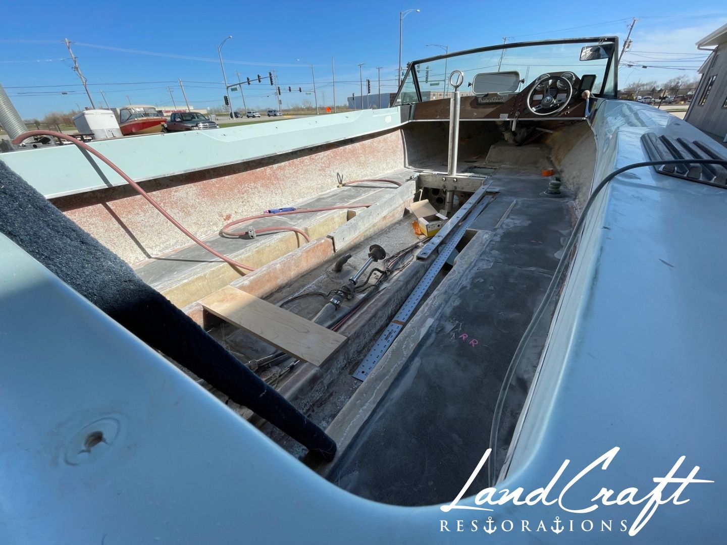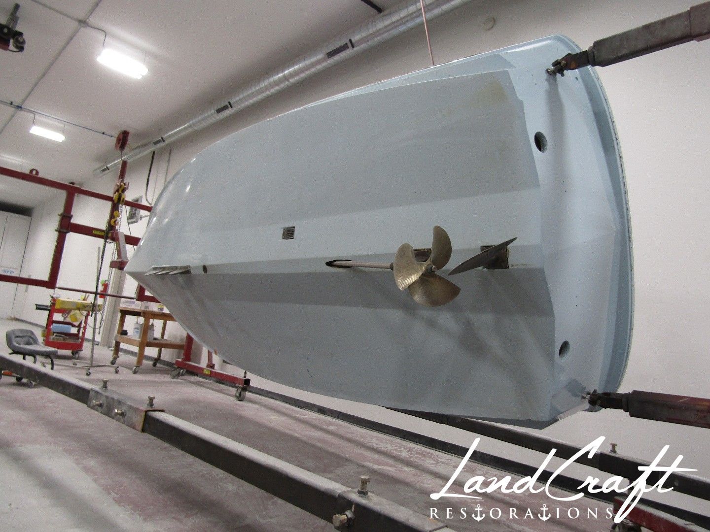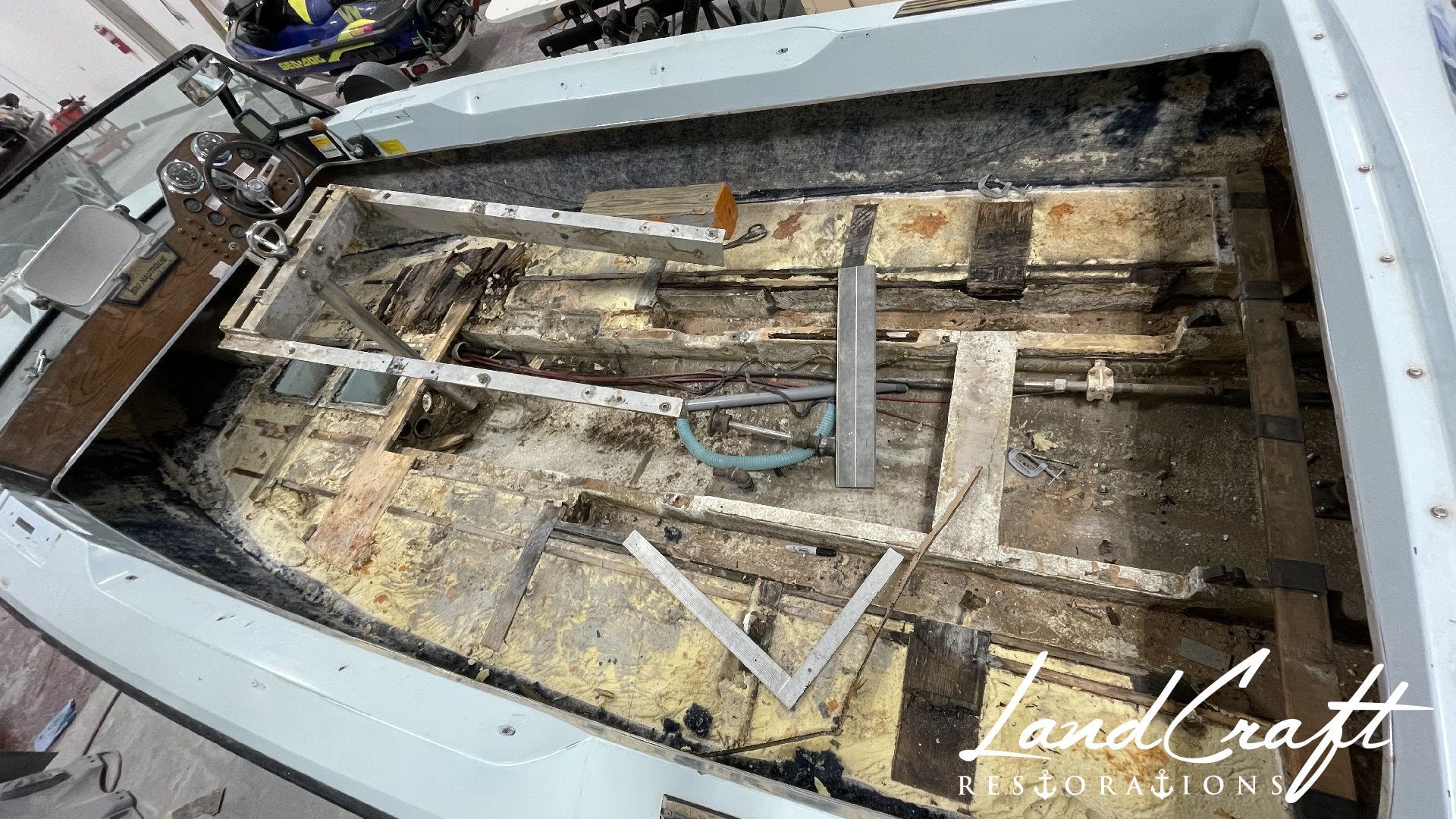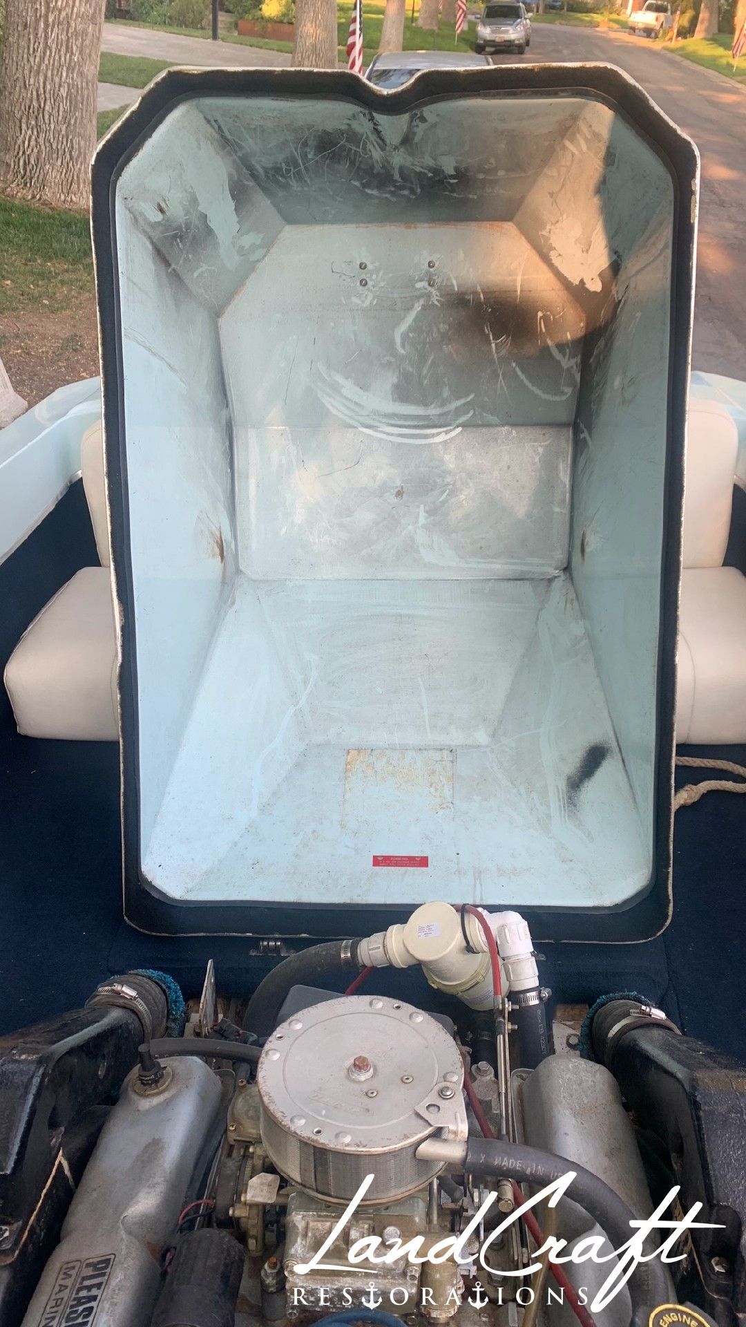 The photos start with the careful removal of the original ornamentation and show upper hull refinishing work before the top cap was lifted to remove the entire rotted wood floor. The Rally was sandwich core balsa constructed which required that sections of the damaged core be replaced as needed to restore a proper hull core. From there, bulkheads were replaced, a new gas tank installed, the transom was re-cored, flotation foam and a new floor also installed. The boat originally had dark blue berber carpeting which we replaced with an upgraded and more durable marine carpeting. The outer hull bottom required fiberglass and gelcoat repair, the original snaps for canvas were removed and holes patched, then we refurbished the original gelcoat and spot-repaired where needed. The windshield was refinished in the original brown color and the instrument panel was updated, refurbished and upgraded. The original steering wheel, hand rails, compass binnacle cover, horn, and cleats were all restored to original condition. The original combo bow light came in with melted plastic lenses and missing hardware—LandCraft® custom fabricated new lenses and retrofitted a new base to the original housing. New teak hatches were custom built for the rear storage compartments, giving the boat even more vintage appeal. New teak trim was custom fitted and installed around the consoles, and brightwork done to any remnants of original teak. Numerous original upholstery pieces were rotted, so the framing was rebuilt and wrapped in marine vinyl that was custom dyed to match the original upholstery. The extra padding of panels required a lot of finesse in the installation process, and you can see much of the interior is upholstered in the custom dyed, imprinted, pleated and button-tucked marine vinyl. The boat has been completely re-wired and also has new rubrail, a new bilge pump, new outboard engine, and more storage space with a custom rear hatch installed over the bilge compartment. The original decals were custom designed and reproduced for this boat, striping re-done to factory specs, a new custom canvas mooring cover and bimini top installed, and a new trailer custom built and painted to match the original.