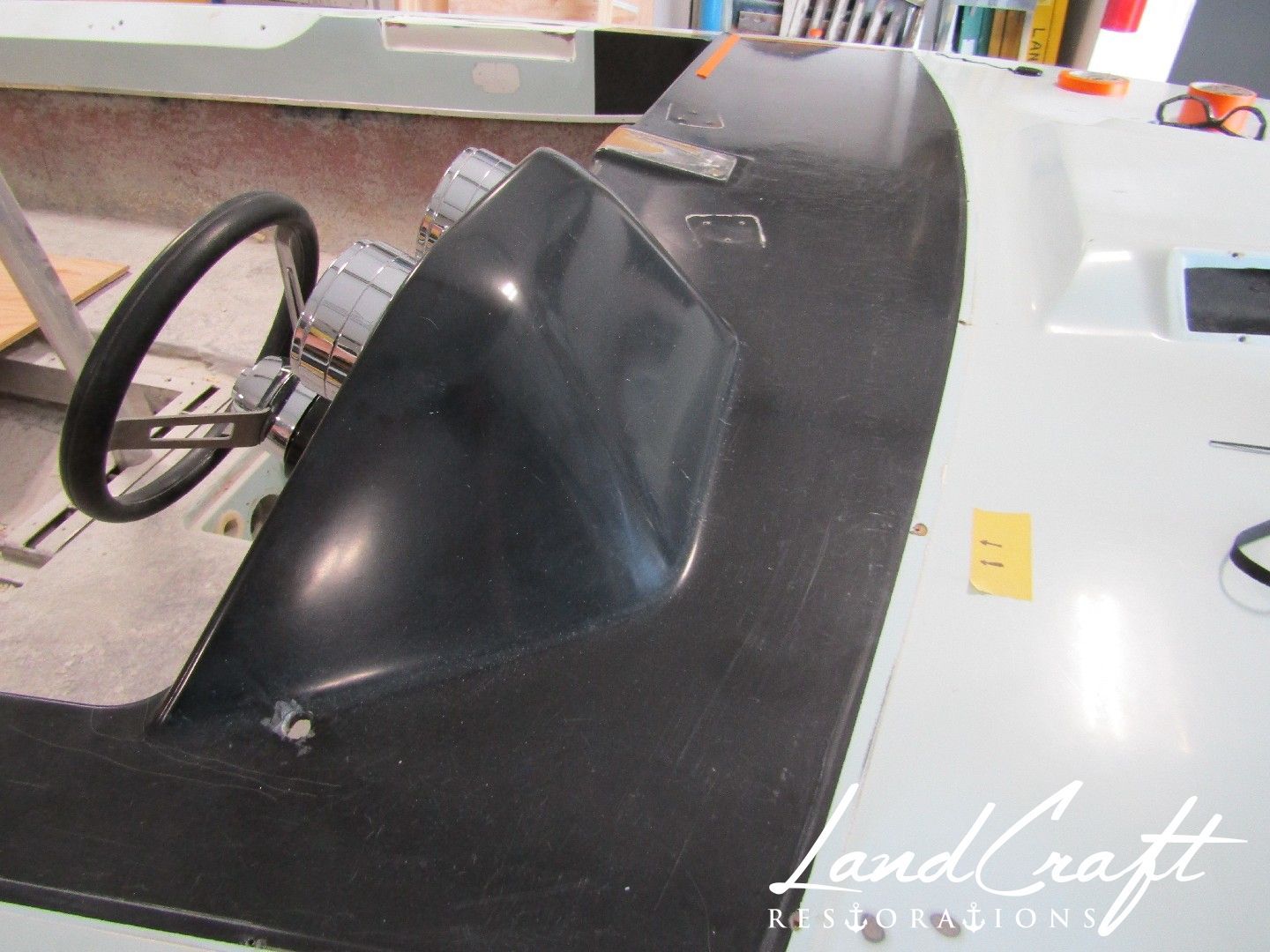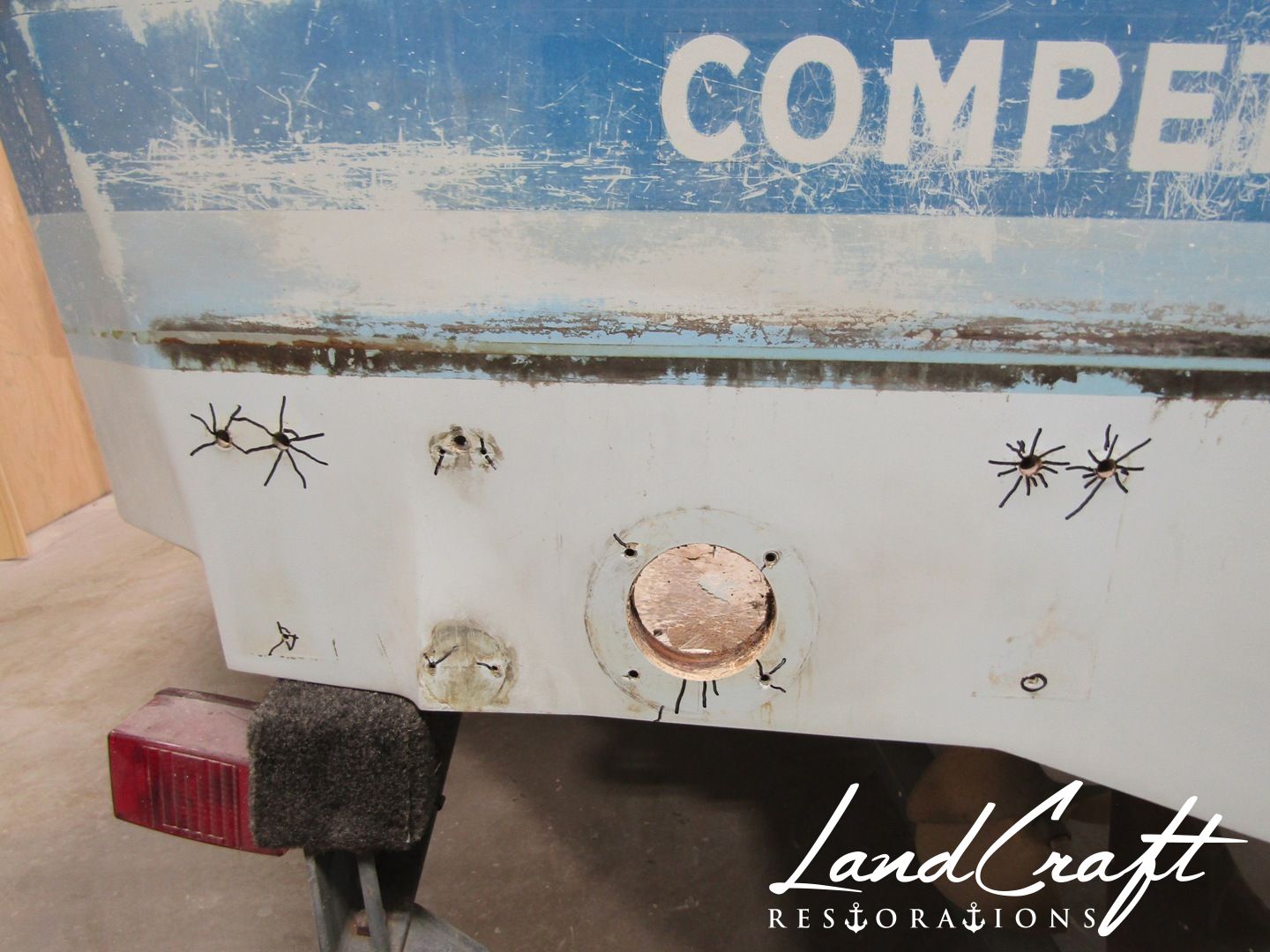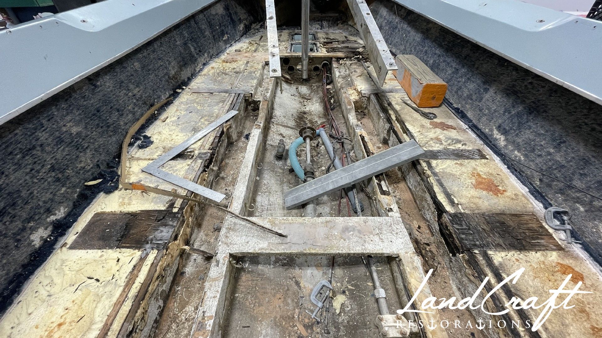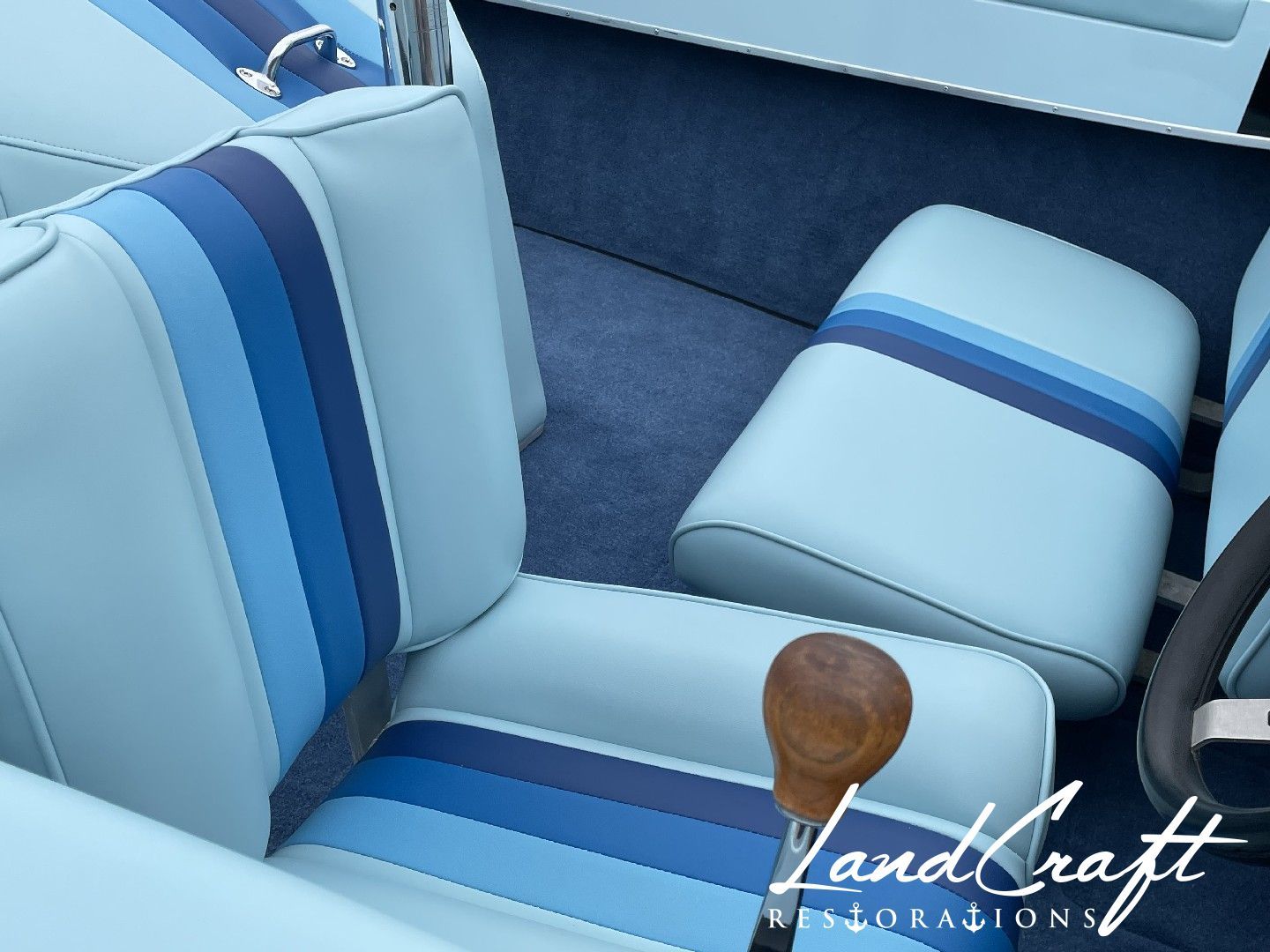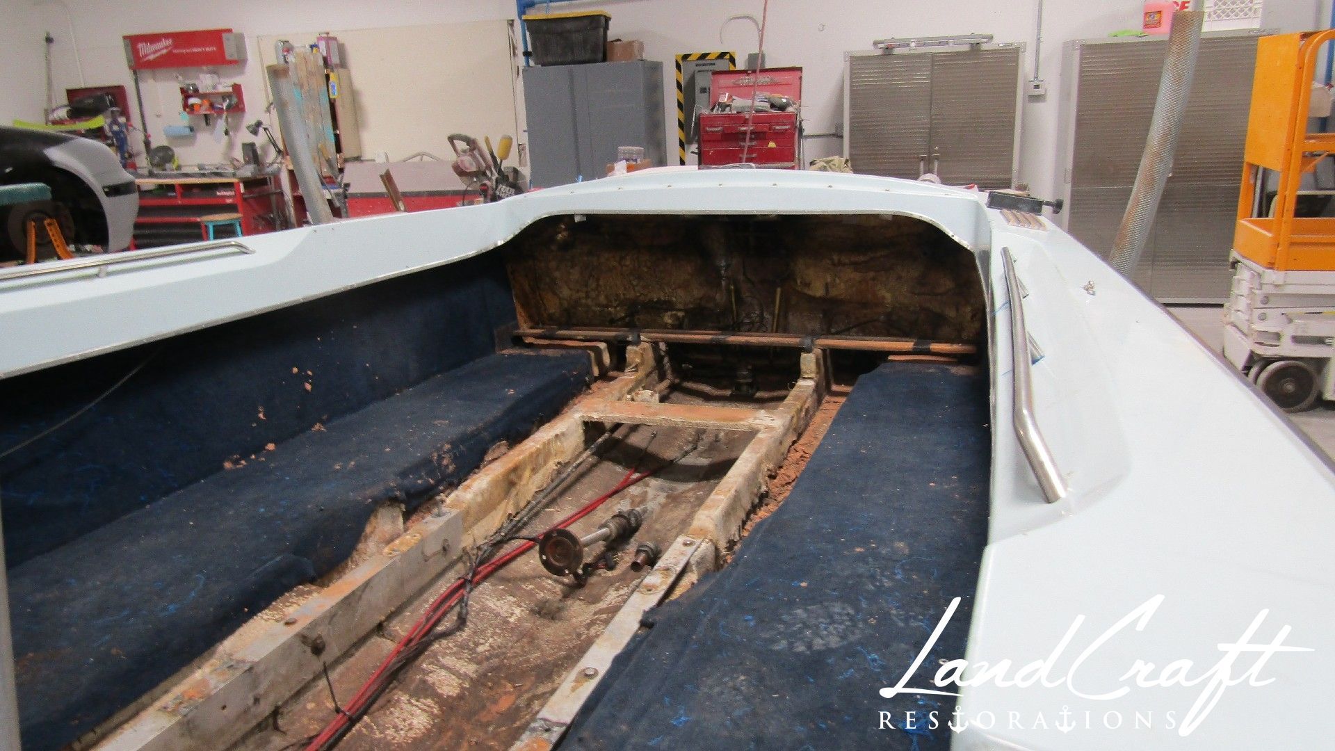 The photos start with the careful removal of the original ornamentation and show upper hull refinishing work before the top cap was lifted to remove the entire rotted wood floor. The Rally was sandwich core balsa constructed which required that sections of the damaged core be replaced as needed to restore a proper hull core. From there, bulkheads were replaced, a new gas tank installed, the transom was re-cored, flotation foam and a new floor also installed. The boat originally had dark blue berber carpeting which we replaced with an upgraded and more durable marine carpeting. The outer hull bottom required fiberglass and gelcoat repair, the original snaps for canvas were removed and holes patched, then we refurbished the original gelcoat and spot-repaired where needed. The windshield was refinished in the original brown color and the instrument panel was updated, refurbished and upgraded. The original steering wheel, hand rails, compass binnacle cover, horn, and cleats were all restored to original condition. The original combo bow light came in with melted plastic lenses and missing hardware—LandCraft® custom fabricated new lenses and retrofitted a new base to the original housing. New teak hatches were custom built for the rear storage compartments, giving the boat even more vintage appeal. New teak trim was custom fitted and installed around the consoles, and brightwork done to any remnants of original teak. Numerous original upholstery pieces were rotted, so the framing was rebuilt and wrapped in marine vinyl that was custom dyed to match the original upholstery. The extra padding of panels required a lot of finesse in the installation process, and you can see much of the interior is upholstered in the custom dyed, imprinted, pleated and button-tucked marine vinyl. The boat has been completely re-wired and also has new rubrail, a new bilge pump, new outboard engine, and more storage space with a custom rear hatch installed over the bilge compartment. The original decals were custom designed and reproduced for this boat, striping re-done to factory specs, a new custom canvas mooring cover and bimini top installed, and a new trailer custom built and painted to match the original.