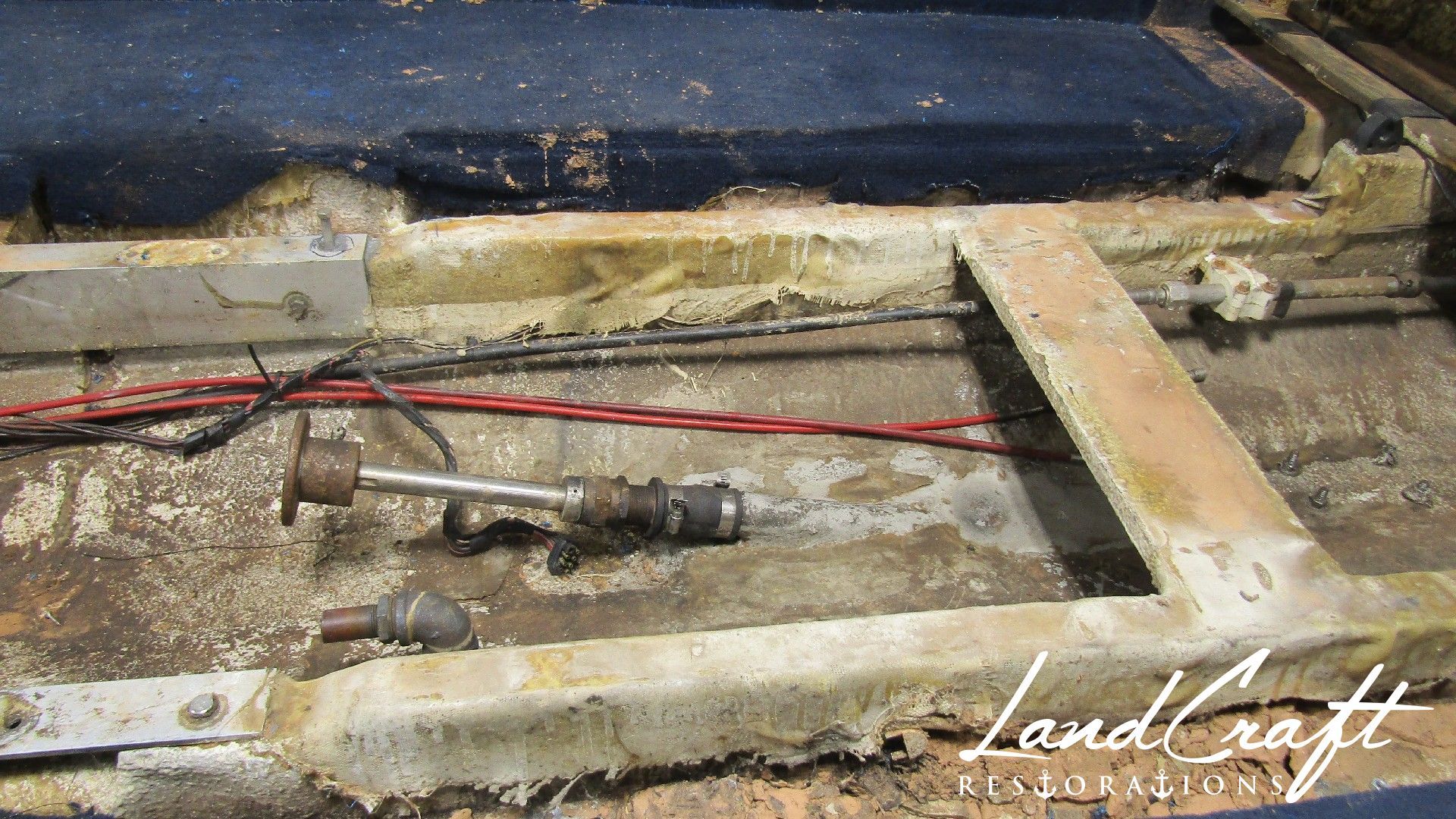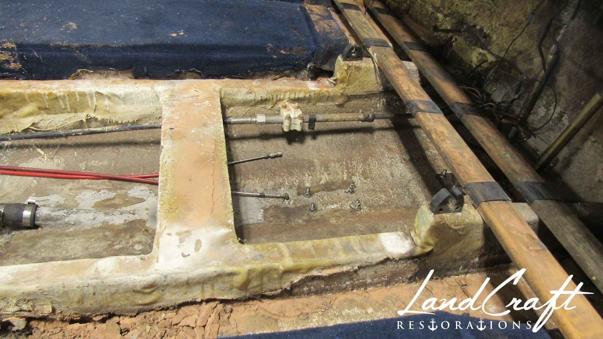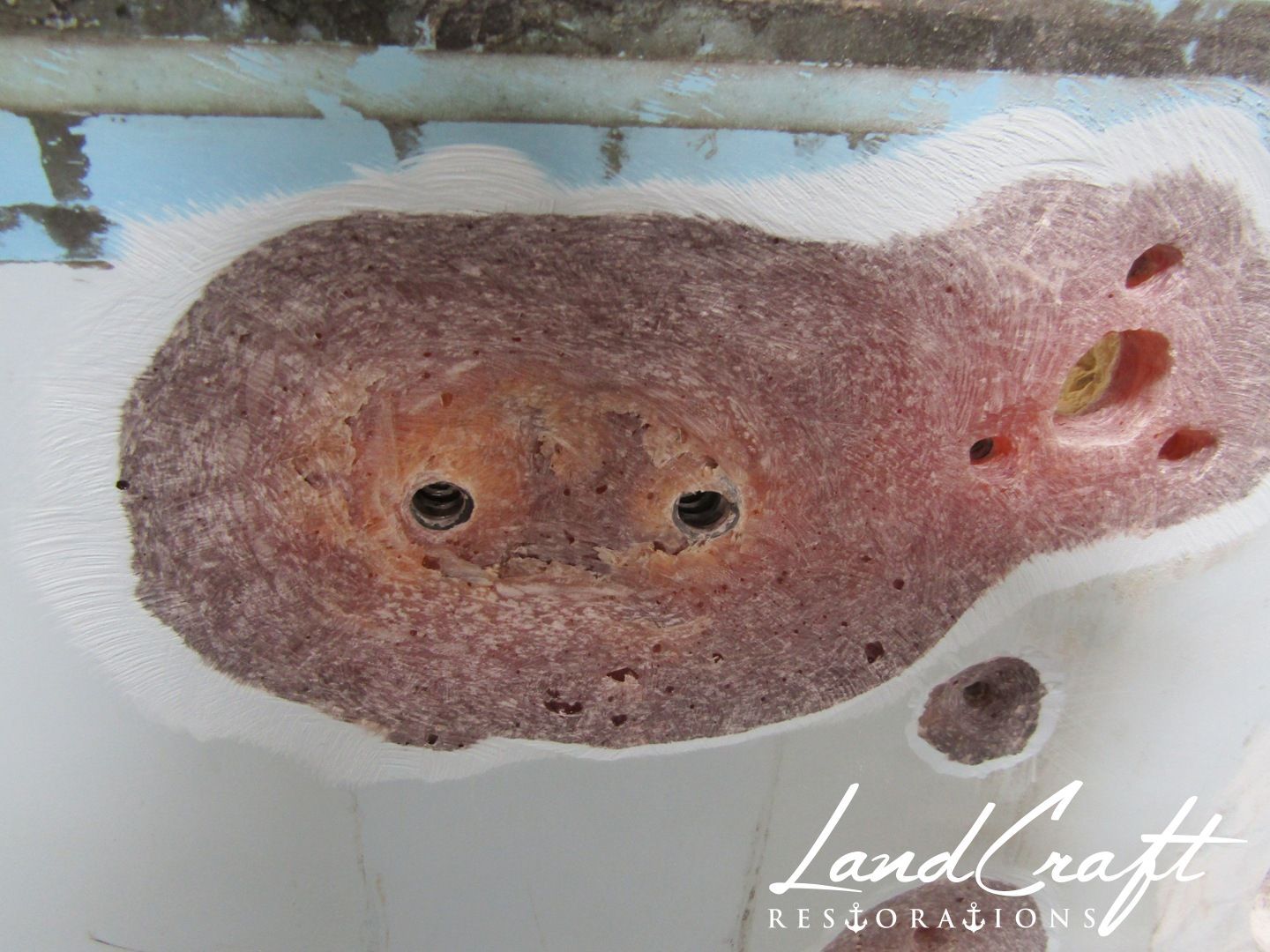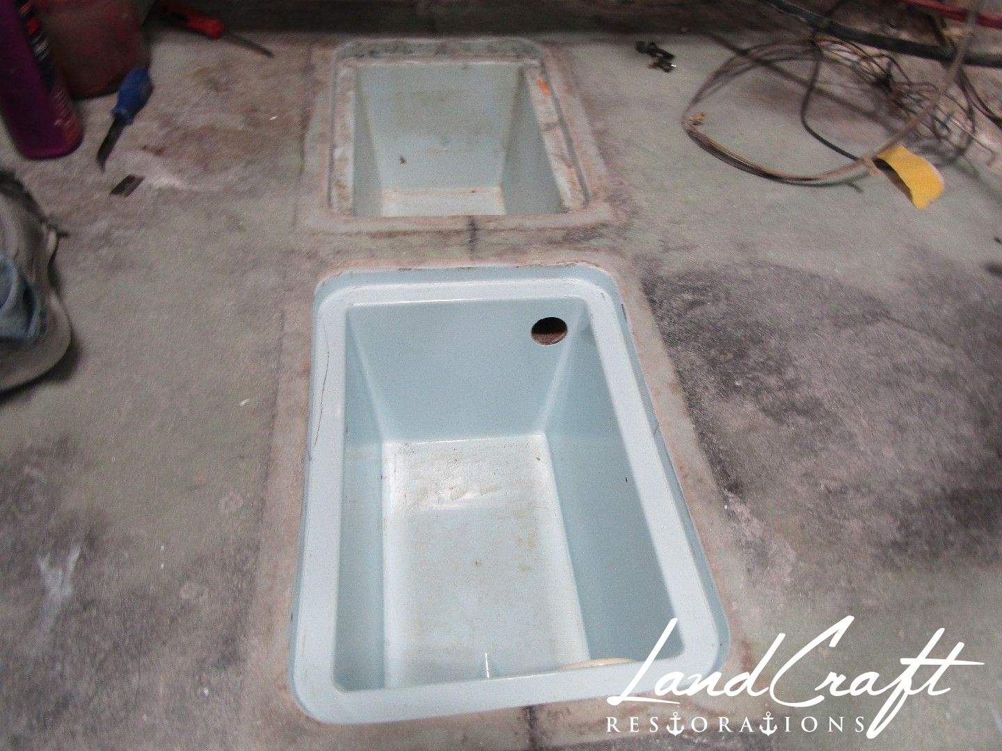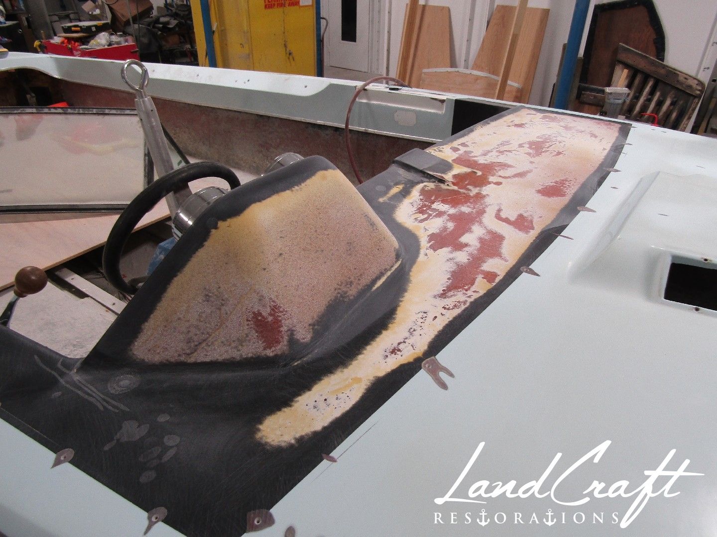 The photos start with the careful removal of the original ornamentation and show upper hull refinishing work before the top cap was lifted to remove the entire rotted wood floor. The Rally was sandwich core balsa constructed which required that sections of the damaged core be replaced as needed to restore a proper hull core. From there, bulkheads were replaced, a new gas tank installed, the transom was re-cored, flotation foam and a new floor also installed. The boat originally had dark blue berber carpeting which we replaced with an upgraded and more durable marine carpeting. The outer hull bottom required fiberglass and gelcoat repair, the original snaps for canvas were removed and holes patched, then we refurbished the original gelcoat and spot-repaired where needed. The windshield was refinished in the original brown color and the instrument panel was updated, refurbished and upgraded. The original steering wheel, hand rails, compass binnacle cover, horn, and cleats were all restored to original condition. The original combo bow light came in with melted plastic lenses and missing hardware—LandCraft® custom fabricated new lenses and retrofitted a new base to the original housing. New teak hatches were custom built for the rear storage compartments, giving the boat even more vintage appeal. New teak trim was custom fitted and installed around the consoles, and brightwork done to any remnants of original teak. Numerous original upholstery pieces were rotted, so the framing was rebuilt and wrapped in marine vinyl that was custom dyed to match the original upholstery. The extra padding of panels required a lot of finesse in the installation process, and you can see much of the interior is upholstered in the custom dyed, imprinted, pleated and button-tucked marine vinyl. The boat has been completely re-wired and also has new rubrail, a new bilge pump, new outboard engine, and more storage space with a custom rear hatch installed over the bilge compartment. The original decals were custom designed and reproduced for this boat, striping re-done to factory specs, a new custom canvas mooring cover and bimini top installed, and a new trailer custom built and painted to match the original.