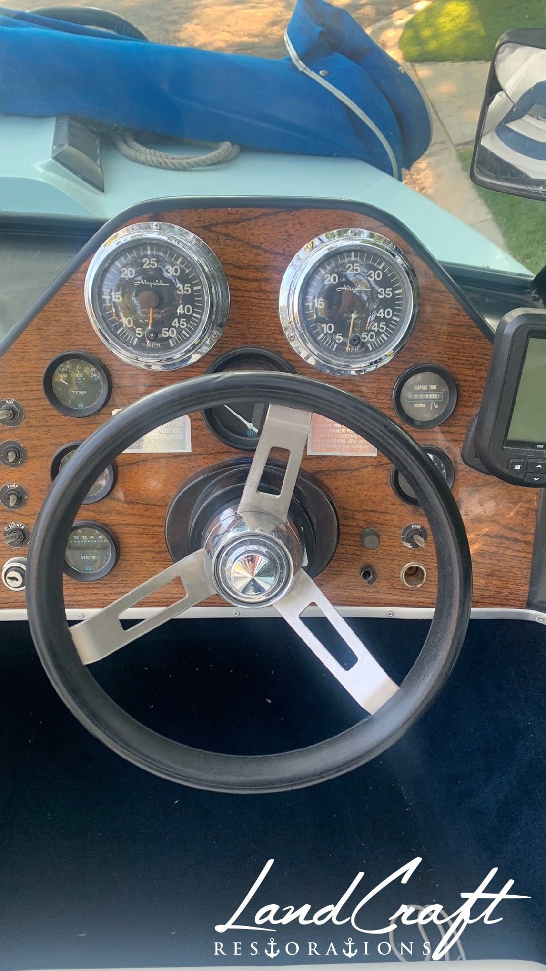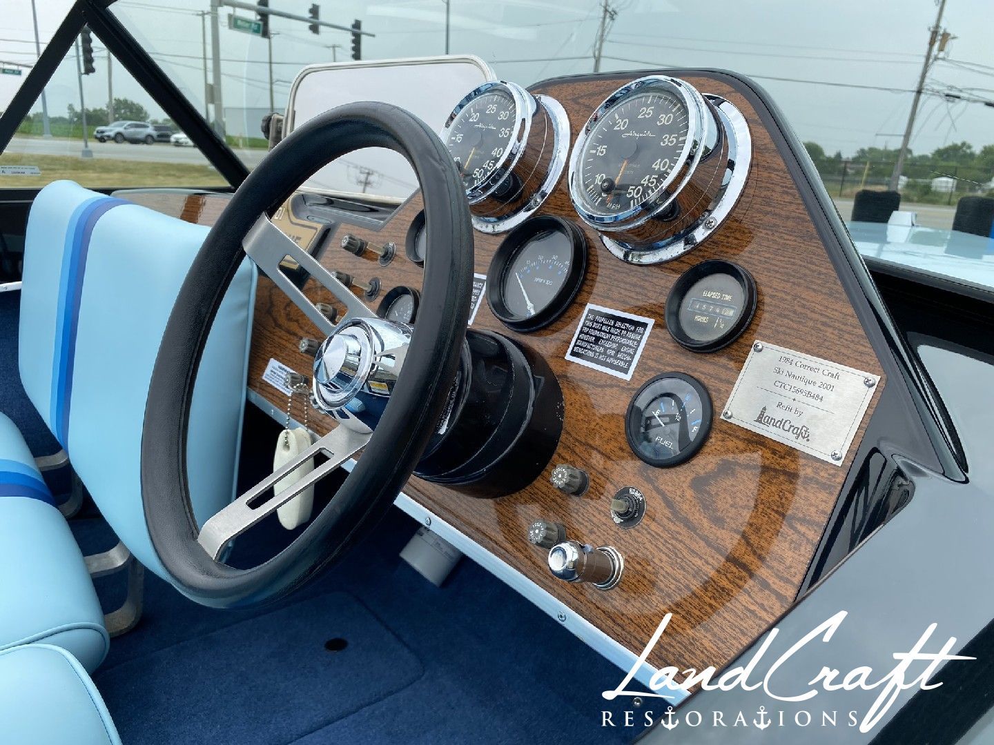 In the after pictures you will see the glossy updated finish, new carpeting, cleaned upholstery, and the original instruments cleaned and reinstalled. What a beautiful classic boat that this family can enjoy for decades to come!