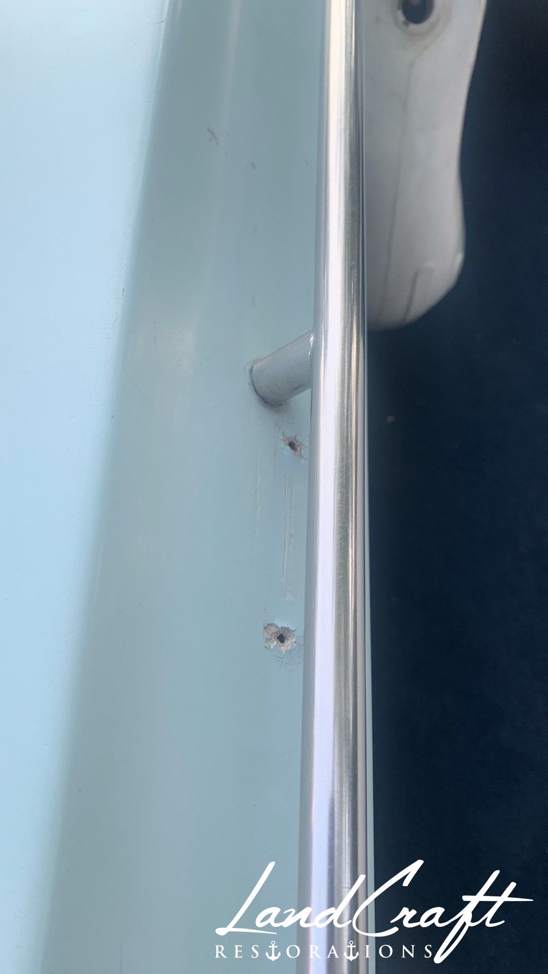 In the before pictures you will see the boat stripped down to the shell, where we removed old carpeting, flooring, upholstery, windshield and instruments. There were a few cosmetic and structural repairs that needed to be performed prior to the refinishing stage, so repairs were completed in stage 2. Metal fabrication was needed to fix part of the missing rub rail. In stage 3, we began the refinishing process using the classic red and white Glastron colors, staying true to the 1960's era that this boat originated.