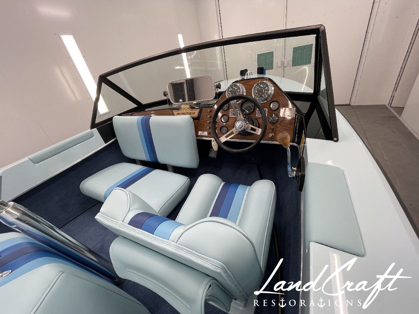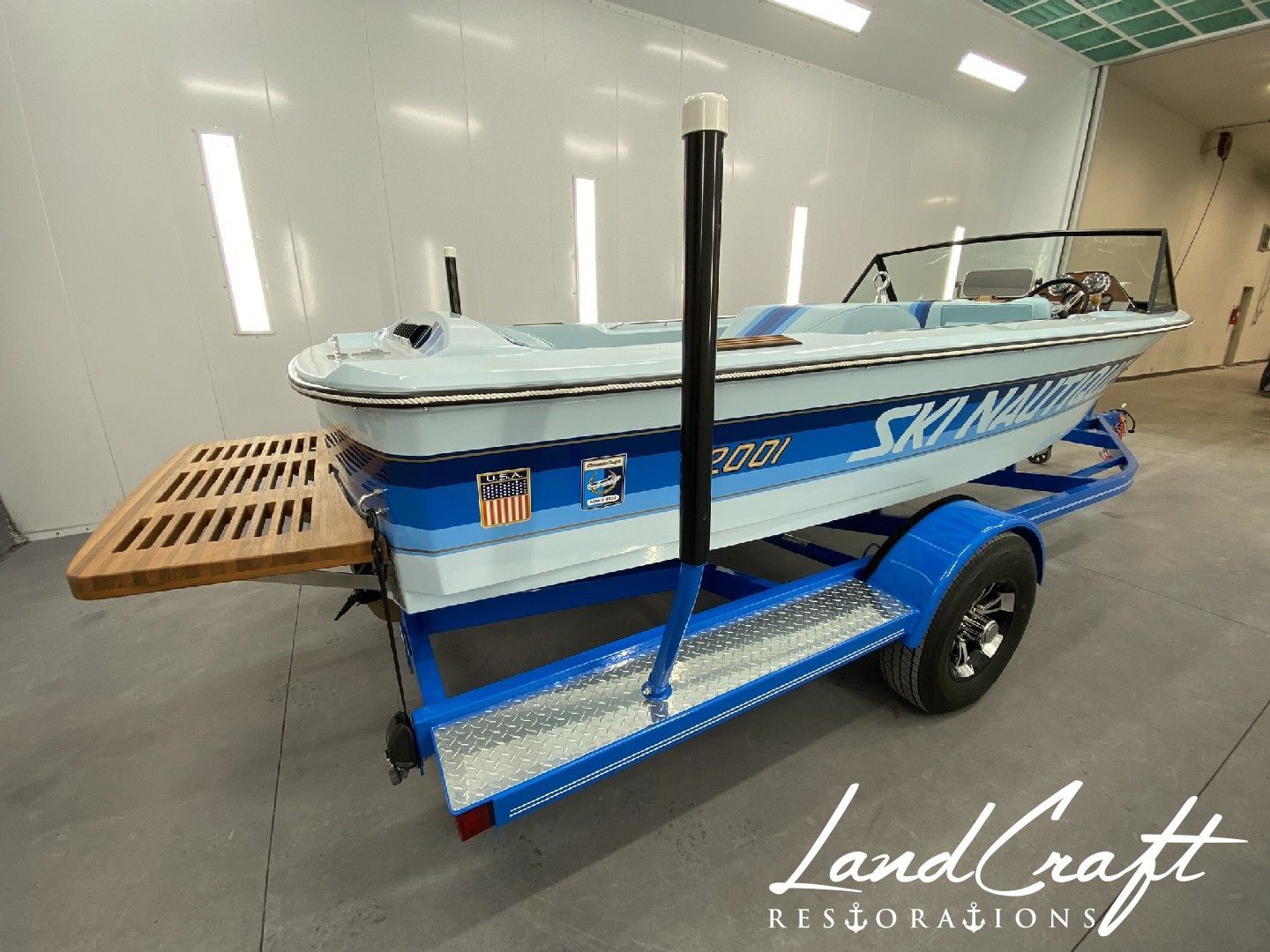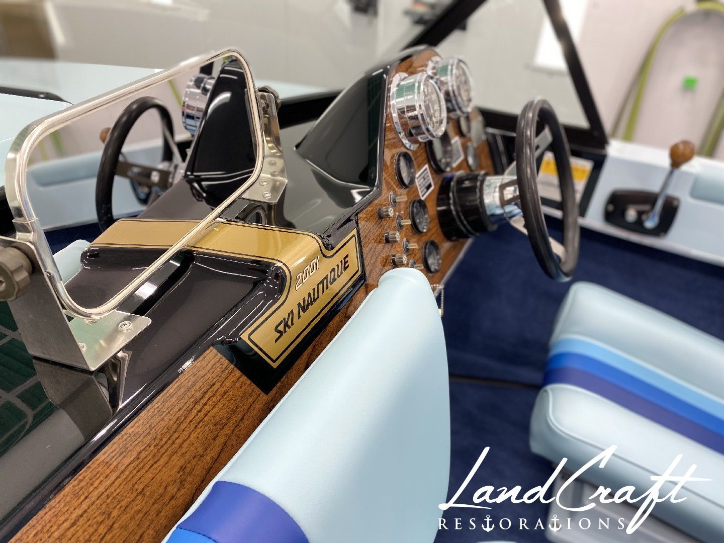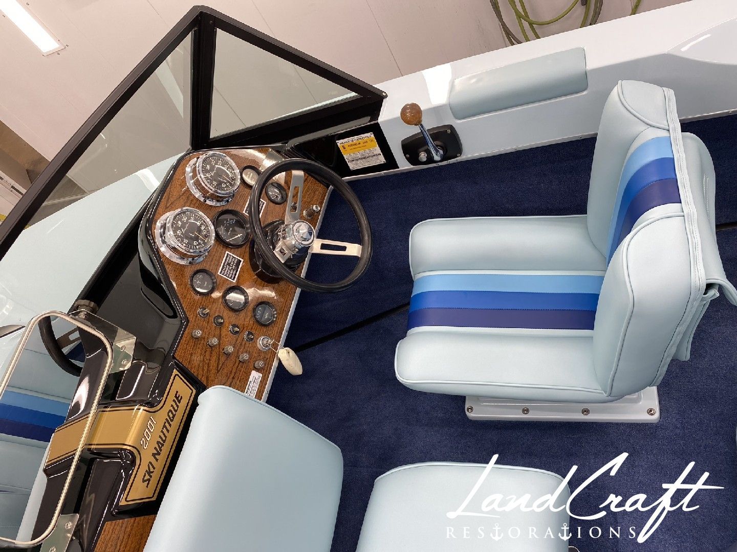 Our client, Marc, brought in his family's classic 1984 Ski Nautique 2001 Competition Ski Boat for a complete factory restoration. He came all the way from Utah! This Ski Nautique carries with it very special memories and LandCraft took great care in every aspect of the refit process. We have restored the exterior with gelcoat that is custom color-matched in-house to original factory colors. The interior upholstery has been returned to the original factory colors and pattern, the original motor has been overhauled and restored, and the boat trailer has been upgraded. There was structural work performed on the interior, and structural and cosmetic repairs completed nearly across the entire boat from the inside out. This 39 year old beauty of a boat has been restored to last another lifetime.