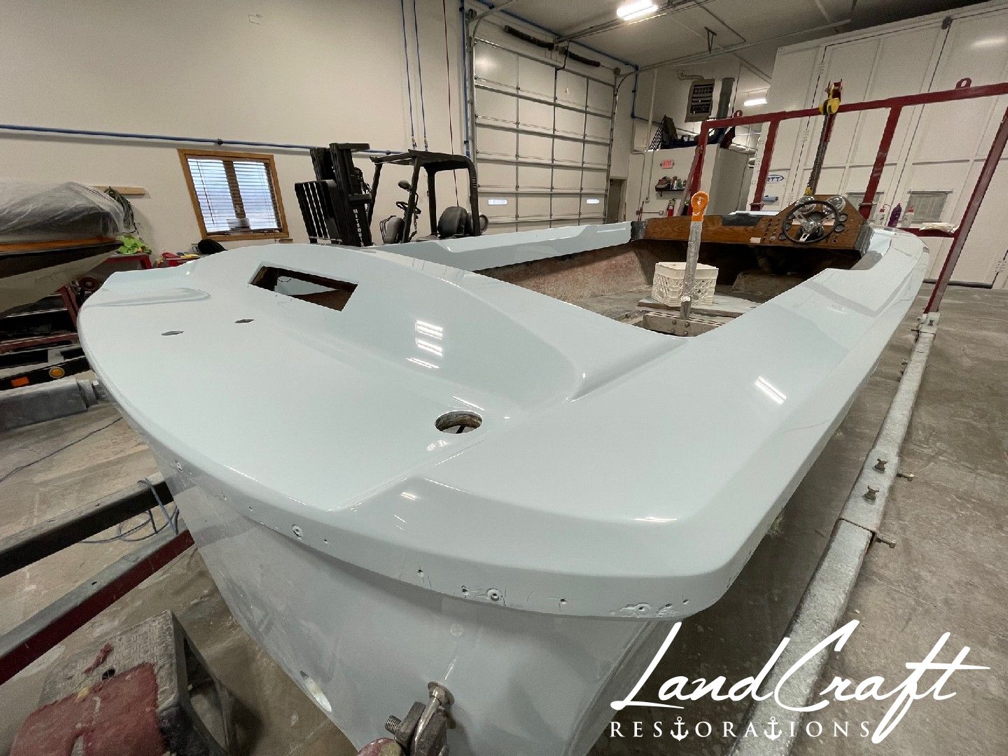 The photos of the exterior restoration process start where we removed old decals and striping and removed the old swim platform and acrylic windshield. After that, fiberglass and gelcoat repairs were completed to the lower bow hull. The remainder of the lower hull was sanded and buffed complete. A lot of attention was given to the metalflake around the hull where various chips, gouges and scratches were repaired. Metalflake was custom mixed in house at LandCraft since MasterCraft factory colors from 1982 were no longer available. While a lot of existing gelcoat and metalflake was able to be refurbished (a rare opportunity for a boat of this age), many portions of the top deck and transom required complete re-gelcoating and metalflake. The foggy and aged acrylic windshield was refurbished, the new teak swim deck was installed and oiled, dash gauge bezels replaced, and a complete and detailed decal kit and striping was installed and spaced to factory specs. Just like our other total boat refits and restoration projects, many details were gone over and addressed. No interior work was done on this project.