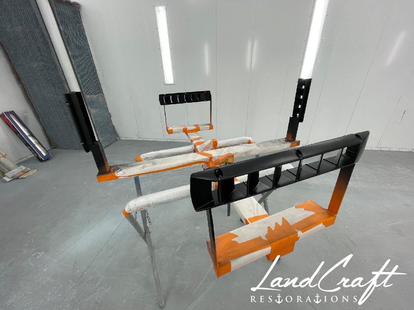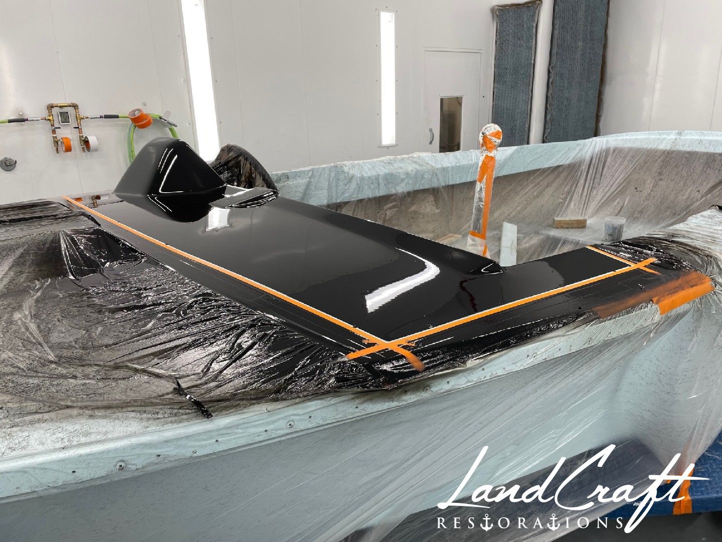 In 2018 LandCraft committed to assisting this cause for a second time, not knowing what we were going to be given to refinish or do in 2019. It was a bigger endeavor than we anticipated. Once Jake and Charles got as far as they could in the build process, the homemade charity rowboat was brought to LandCraft to complete the boat build. We couldn't just slap gelcoat on the boat that we received. It wouldn't look right, but it also required a lot of work to complete the build and bring it to a safe, usable condition. The boat's foundation had to be addressed before any refinishing stages. You'll see photos of the front of the boat and a panel that were both unattached which required fabrication and finesse to attach and bond to the structure. We had to properly laminate in the riggers for the oars to give the rowers a sturdier foundation to row. The thin wood used for the build had low spots everywhere that had to be faired out to a smooth finish. The lines of the joined panels left uneven body lines around the boat that had to be worked and straightened. The bodyline-heavy bow section needed extensive labor time to straighten and bring to shape, and that required 41 years of craftsman experience to do. A keel was constructed and added to the hull to help the rowers keep a steady course. The floor decking had no proper insulation or strength, so we cut into the floor and filled it with foam to add strength and help prevent rowers from falling through. And finally, we refinished the rowboat in gelcoat. The re-purposed trailer we were provided to put the boat on was not setup for a rowboat, especially not one in the delicate condition of this boat. Over 32 additional hours were required to fabricate the trailer to properly support the lightweight custom rowboat. The rowboat looks exactly how we envisioned it to look, and it took over 300 hours of professional work to get it to look that way. We think we got it looking like the photo concept and ready to be wrapped and looking nice for a 250k corporate sponsor! The rowers can now safely get across Lake Michigan in proper conditions for a rowboat and commit to their cause.