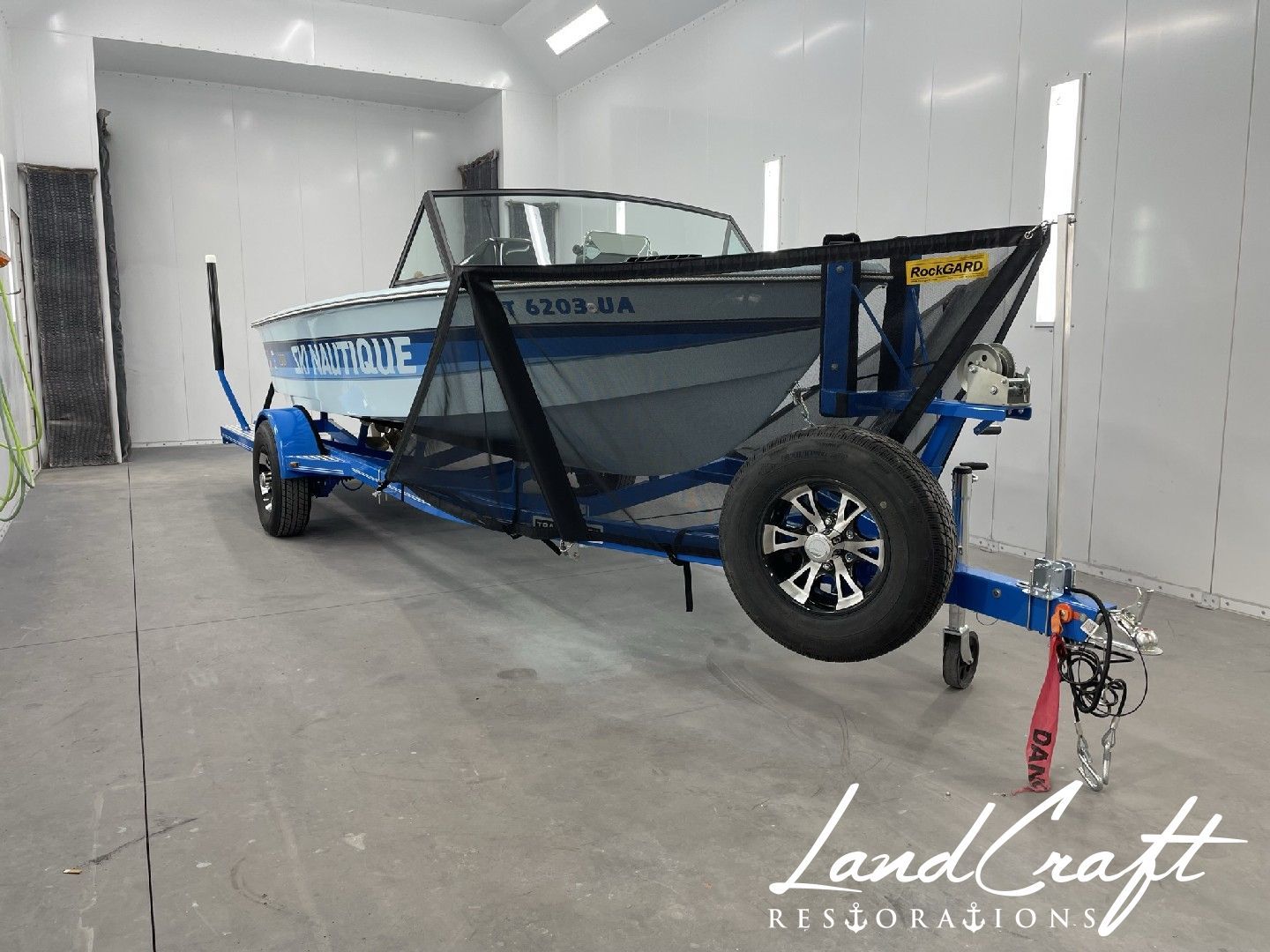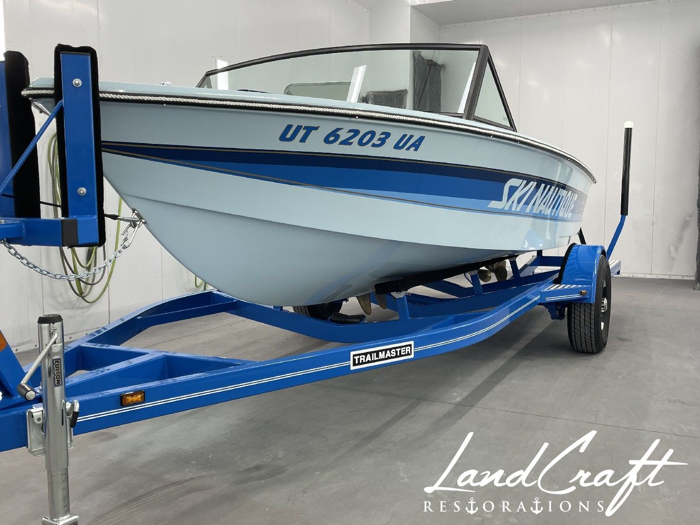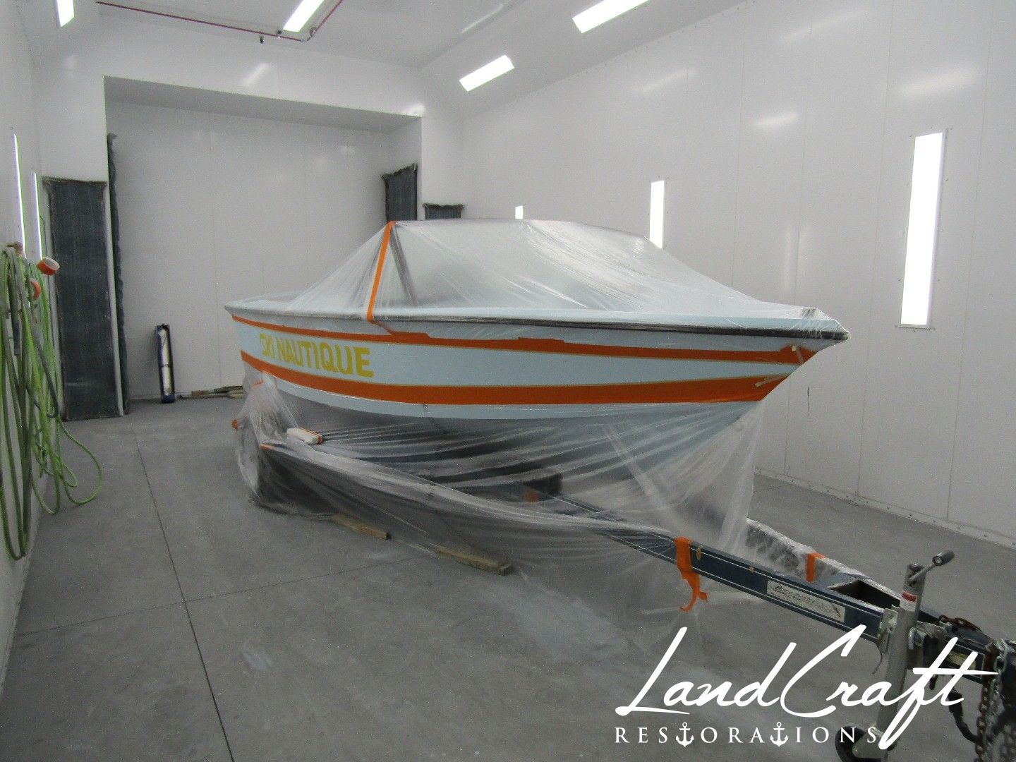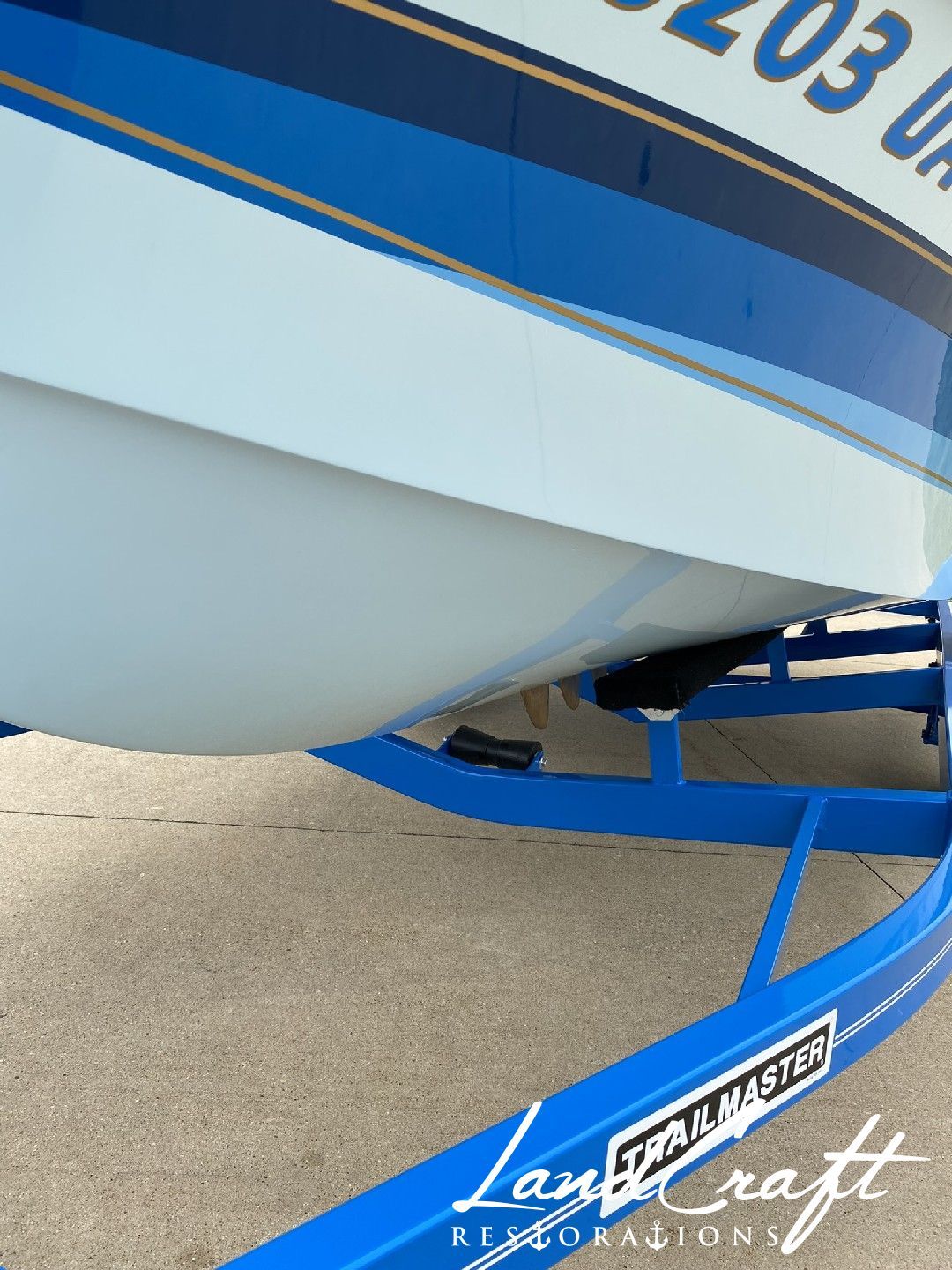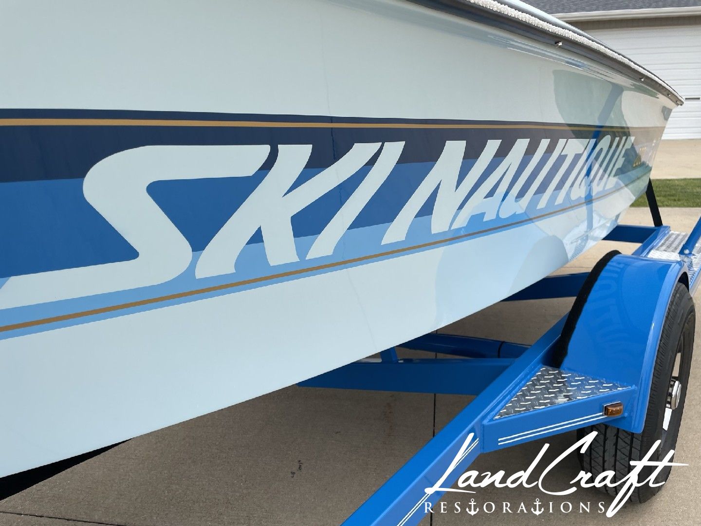 The photos of our Ski Nautique restoration begin with the process where we removed old decals and striping, removed old upholstery and carpet, and prepped the boat for it's new color, which was chosen by the boat owner. At the time of restoration, the owner opted to keep the boats trailer in its original color, however, LandCraft Marine does offer boat trailer refinishing to match the color(s) of the boat.