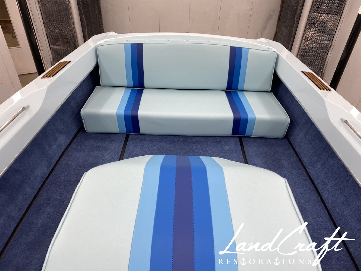 The photos start with the removal of the original interior and carpeting. Our client wanted us to remove the rear bench seat and extend the side panels to the transom of the boat, which we extended and then re-upholstered. The teak swim platform was restored, windshield was refinished in black, minor fiberglass work completed, new upgraded plush carpeting was installed, aftermarket wakeboard tower built and installed, complete exterior refurbishing (including the bottom hull), and interior completely re-upholstered to factory specs.