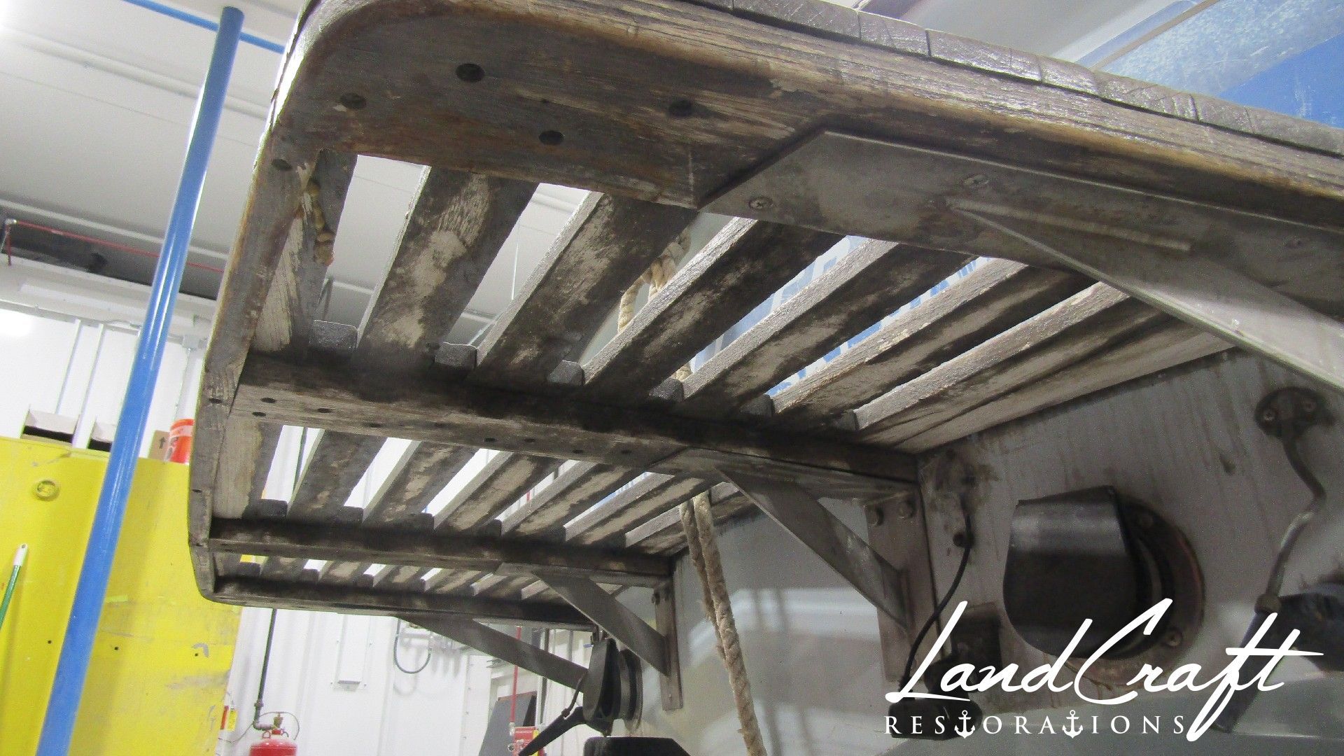 You will see in the pictures below the construction of the new bed platform and custom bed, custom made ladder, repaired interior seating and custom sun pads for the top deck that LandCraft provided in quality form.